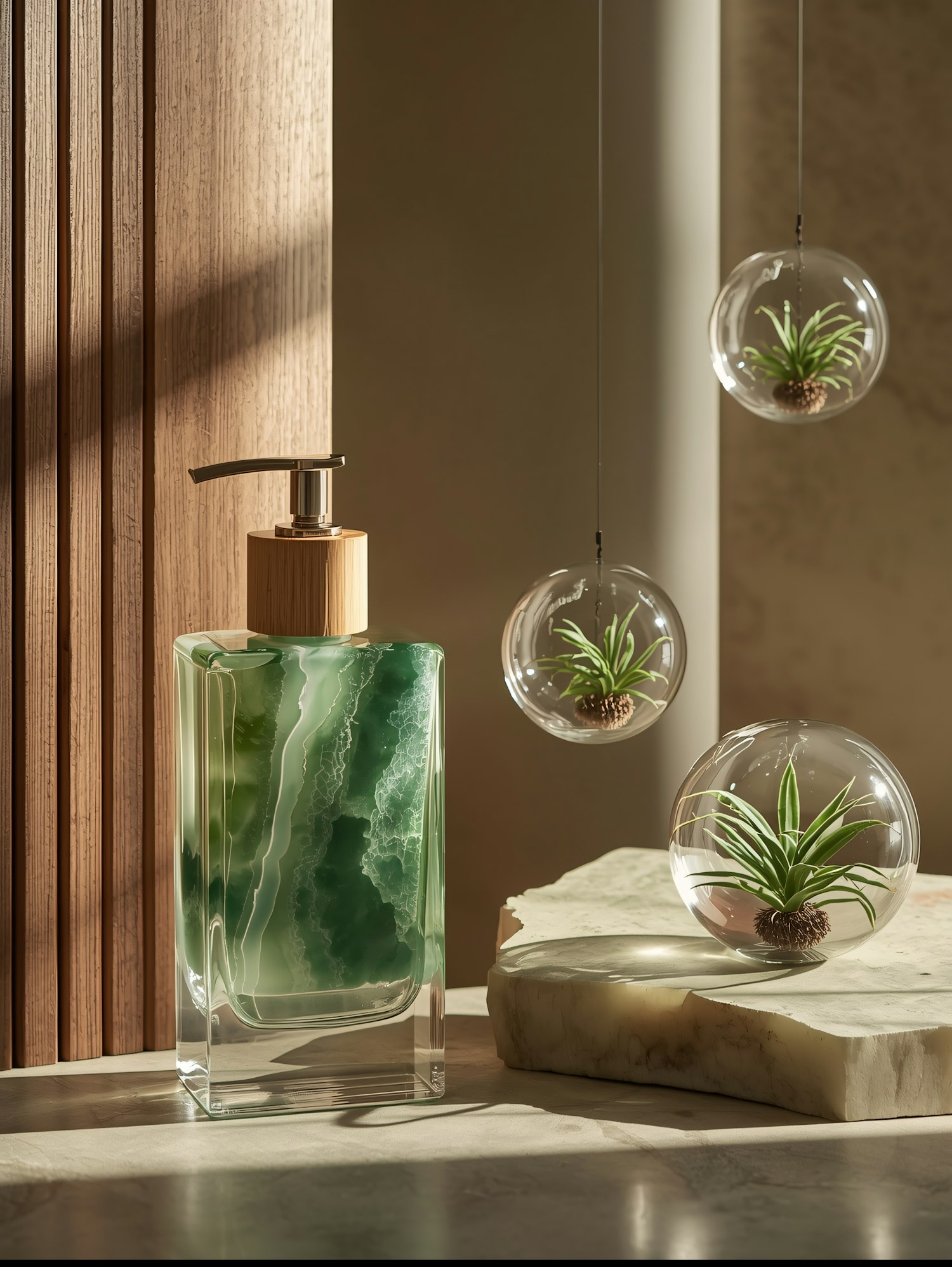 Elegant green marbled soap dispenser with wooden accents, paired with hanging glass globes containing air plants, in a serene setting.