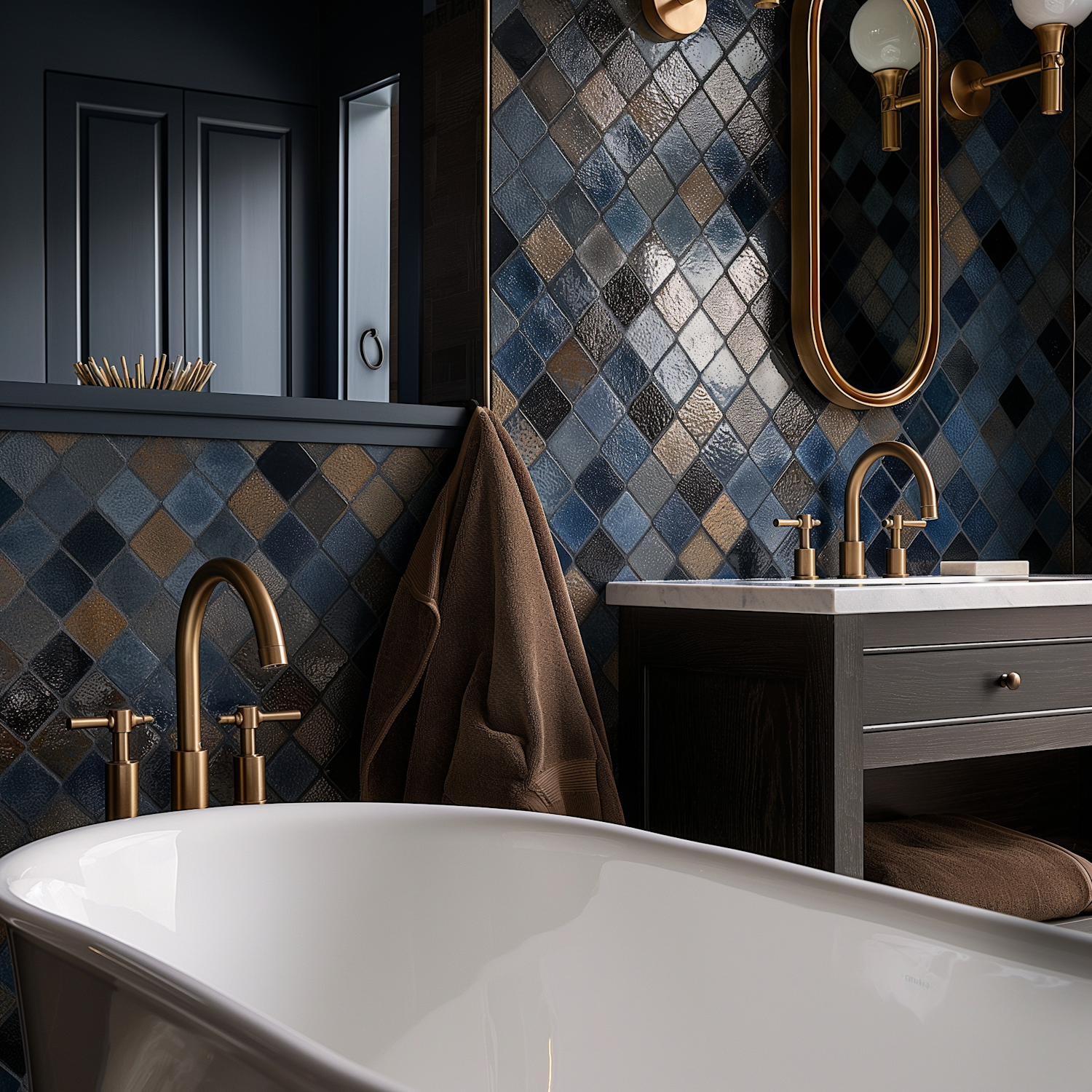 Luxurious bathroom with blue and brown tiles, gold fixtures, and a white tub. Elegant design with a dark wooden vanity and gold accents.