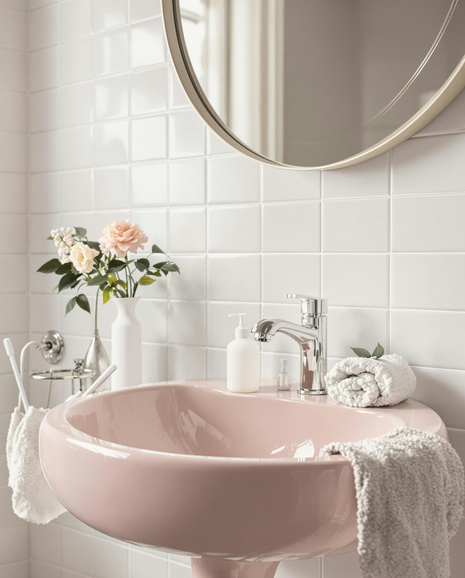 A pastel pink sink adorned with white towels and flowers in an elegant bathroom setting, framed by a round gold mirror and glossy tiles.