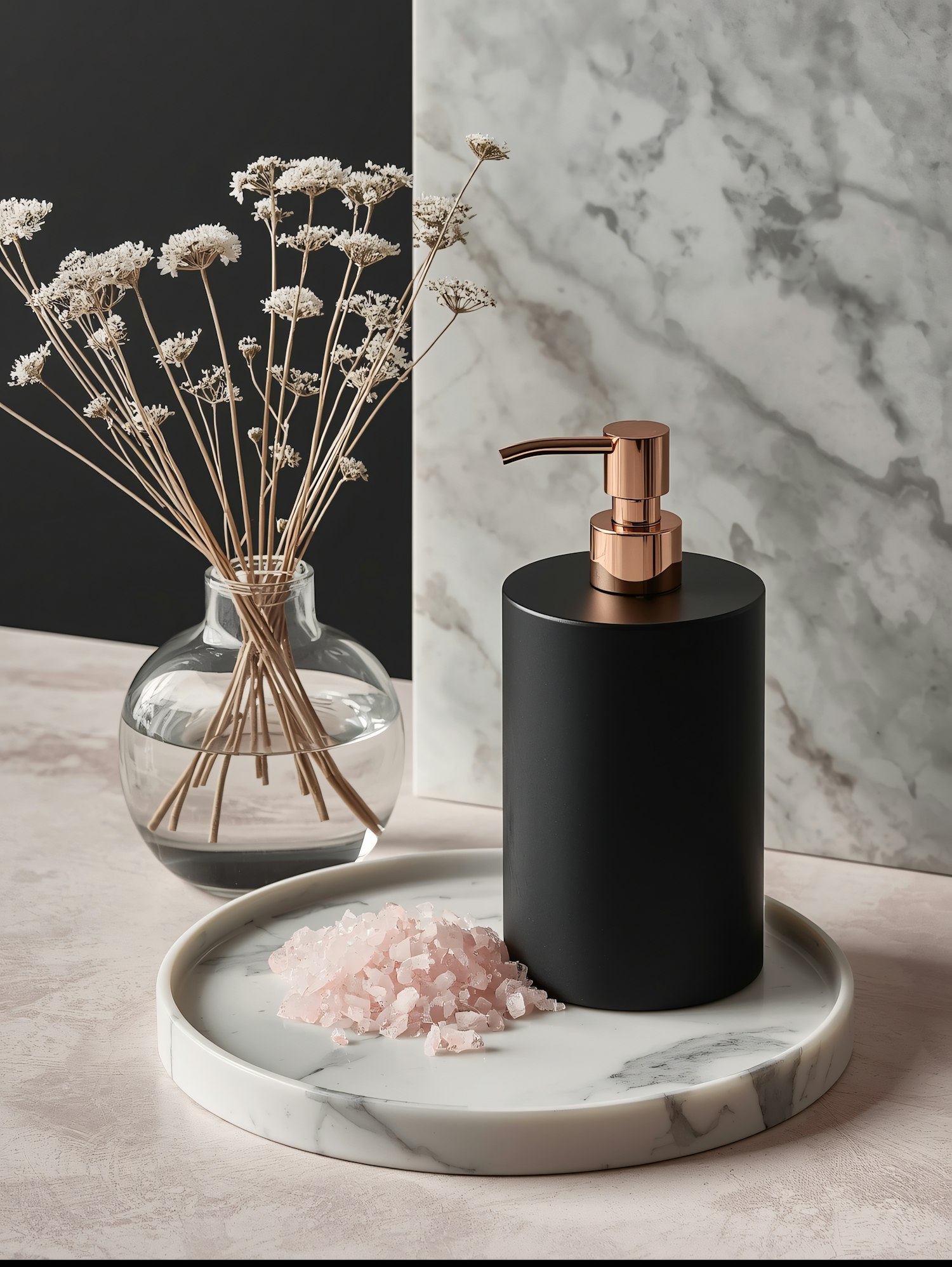 Elegant black soap dispenser with rose gold pump, pink Himalayan salt, and dried flowers on a marble tray for a chic bathroom decor.