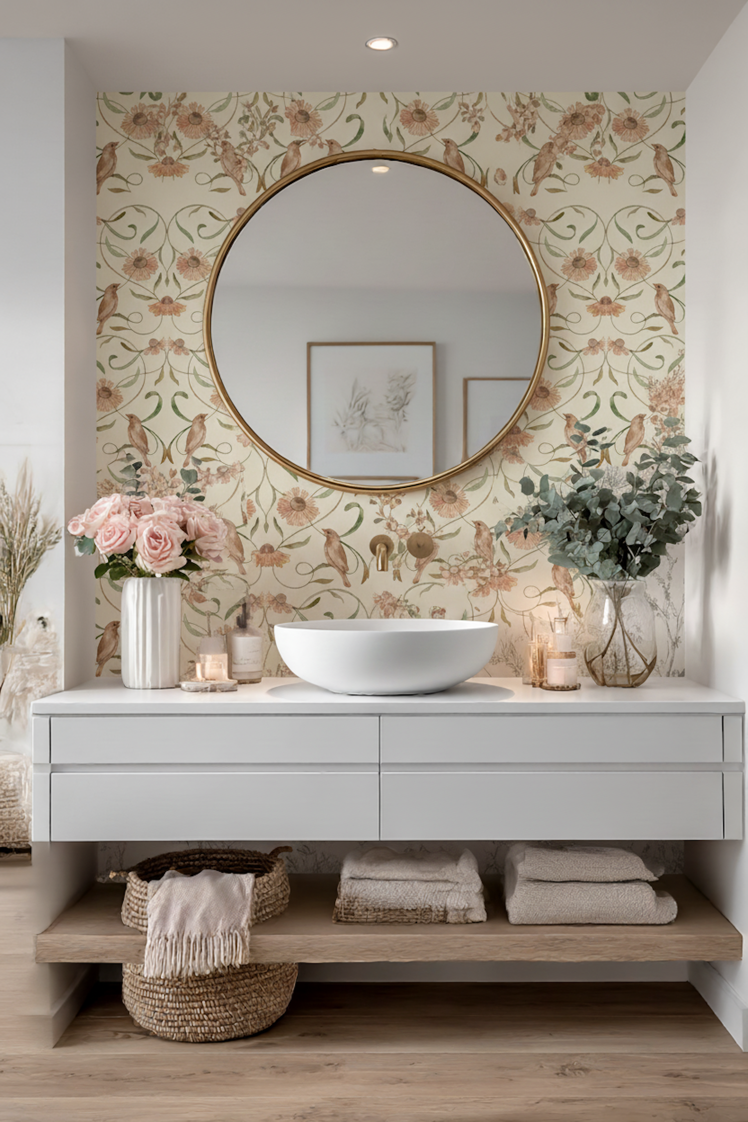 Modern bathroom vanity with floral wallpaper, round gold mirror, vessel sink, and decorative accents like flowers and candles.