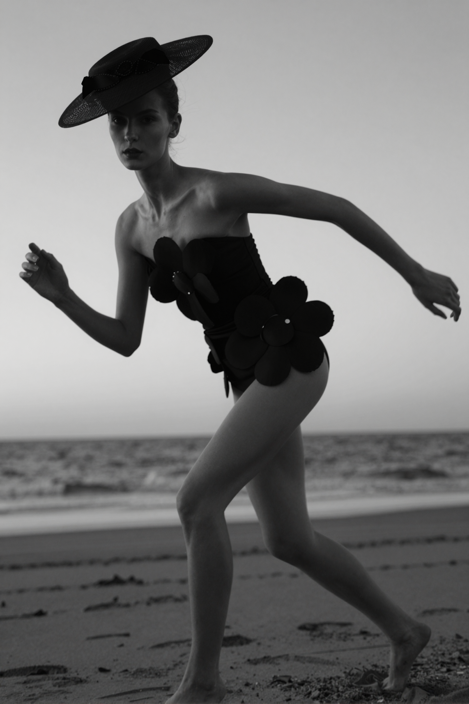 A black-and-white photo of a person in a floral outfit and hat, posing dynamically on a beach with the ocean in the background.