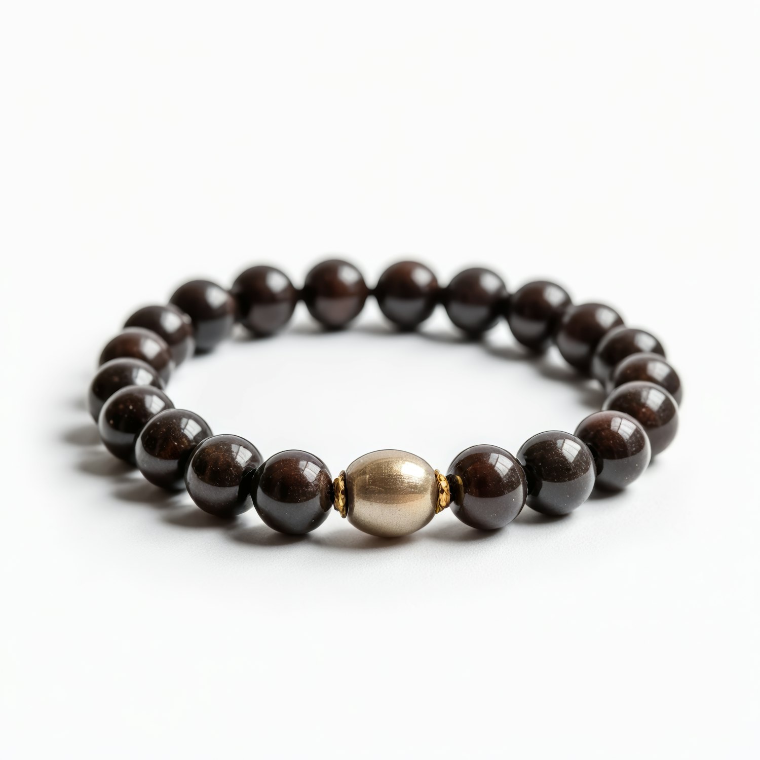 Elegant bracelet with dark brown beads and a central golden bead, perfect for a stylish accessory.