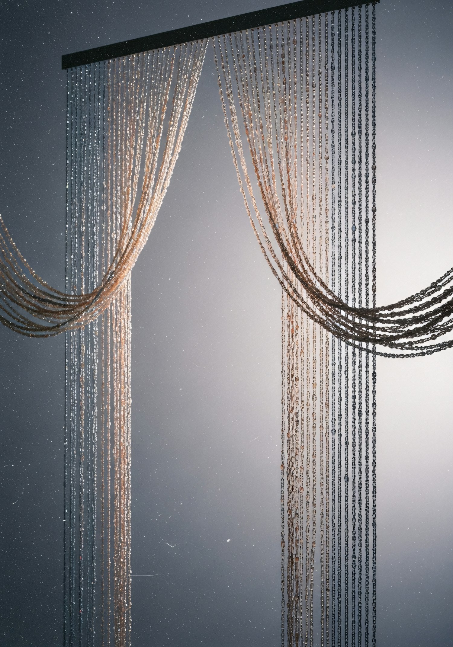 Elegant hanging bead strands drape symmetrically, shimmering against a soft gradient background, creating a sophisticated visual.