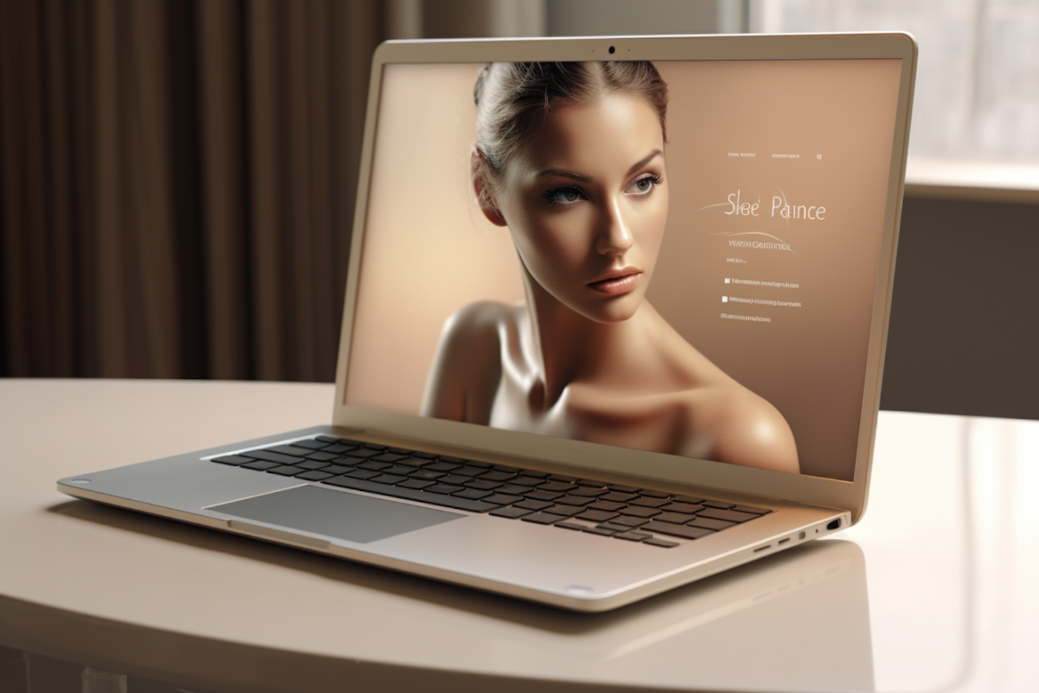 Modern laptop displaying a high-resolution image of a woman with a soft beige background, set on a round table indoors.