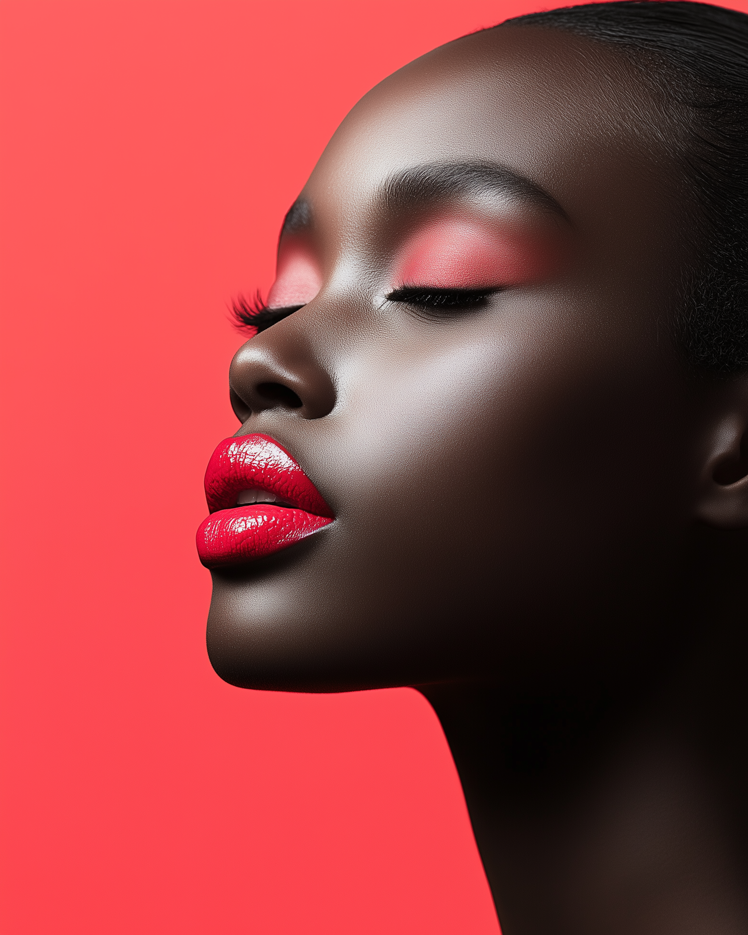 Elegant portrait of a Black woman with bold red makeup against a vibrant red background, exuding confidence and style.