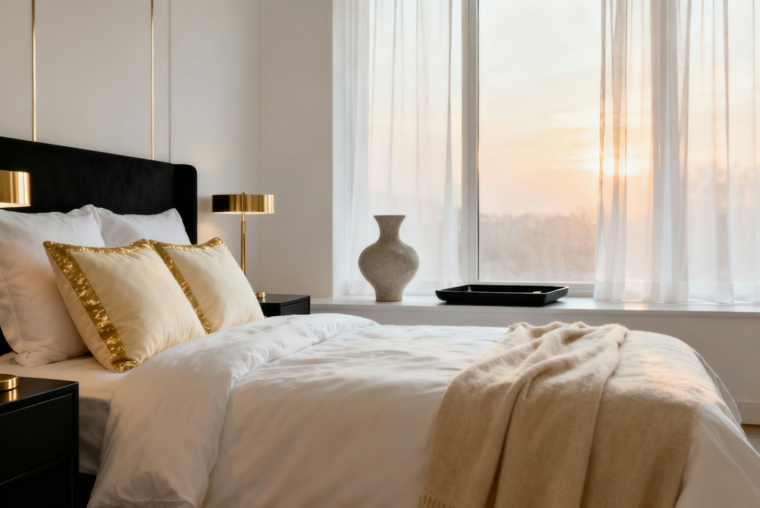 A stylish bedroom with white bedding, gold-accented pillows, and modern decor, illuminated by soft natural light through sheer curtains.