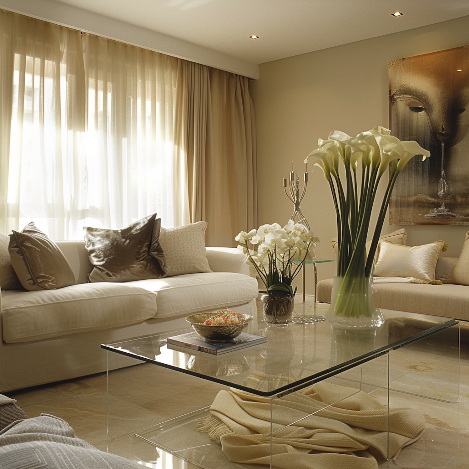 Elegant living room with cream sofa, glass table, and calla lilies. Warm lighting and neutral tones create a serene ambiance.
