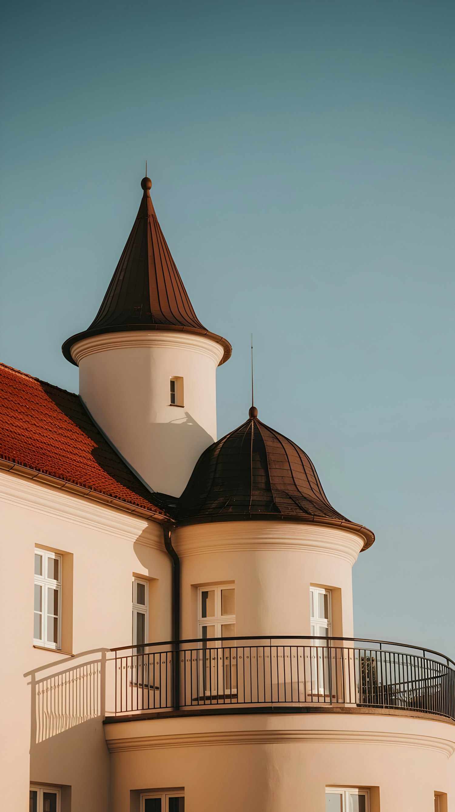 Elegant beige building with rounded towers, dark brown roofs, and a curved balcony under a clear blue sky.