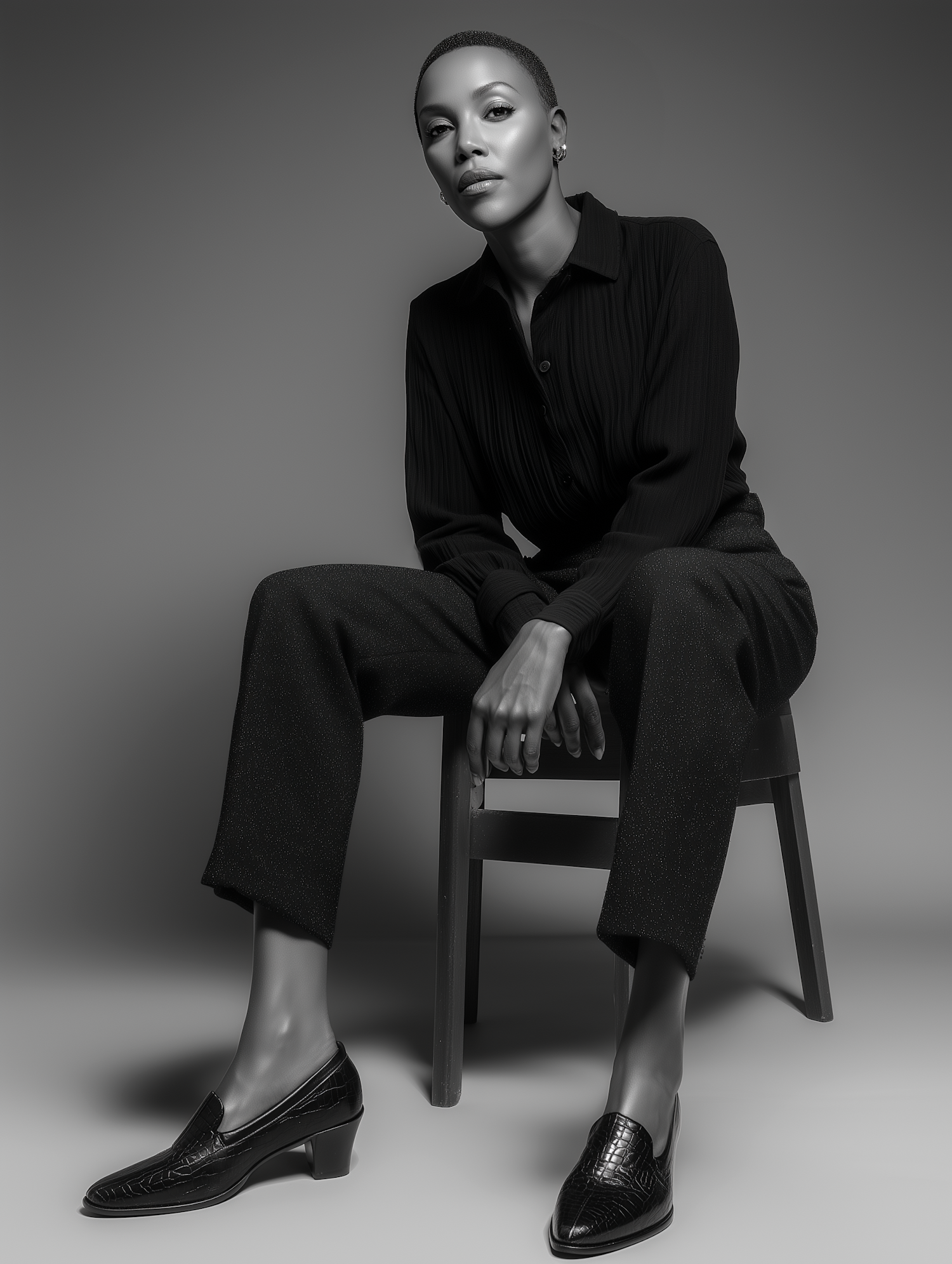 Stylish black-and-white portrait of a confident individual in sleek black attire and heeled loafers, seated on a wooden chair.