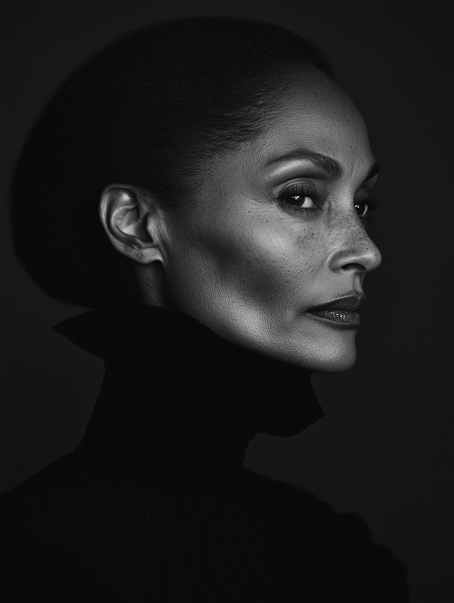 Elegant black and white portrait of a woman with a strong profile, highlighting her serene expression and sophisticated style.