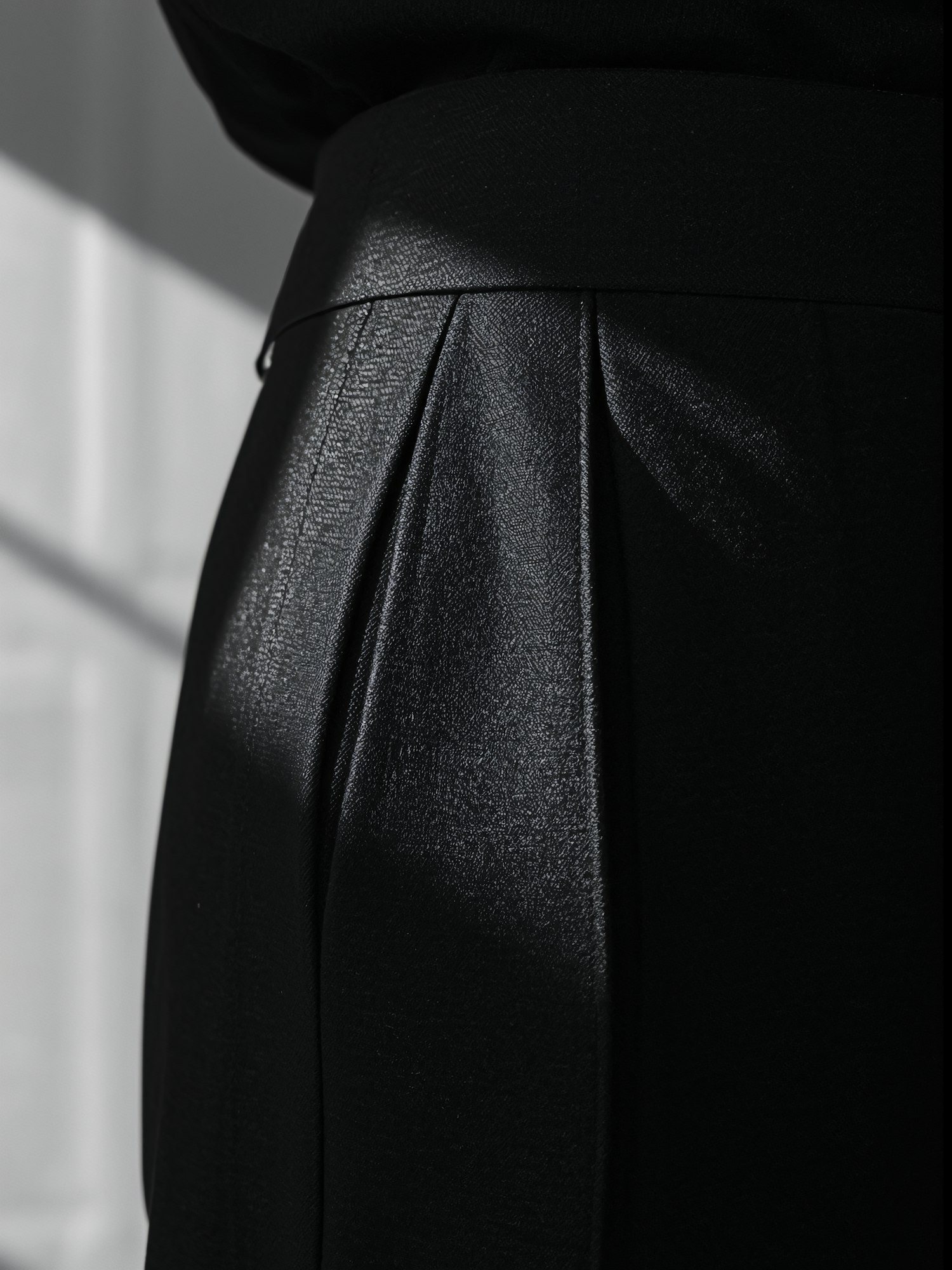 Close-up of a black pleated garment with a subtle sheen, highlighting its texture and elegant design under soft lighting.