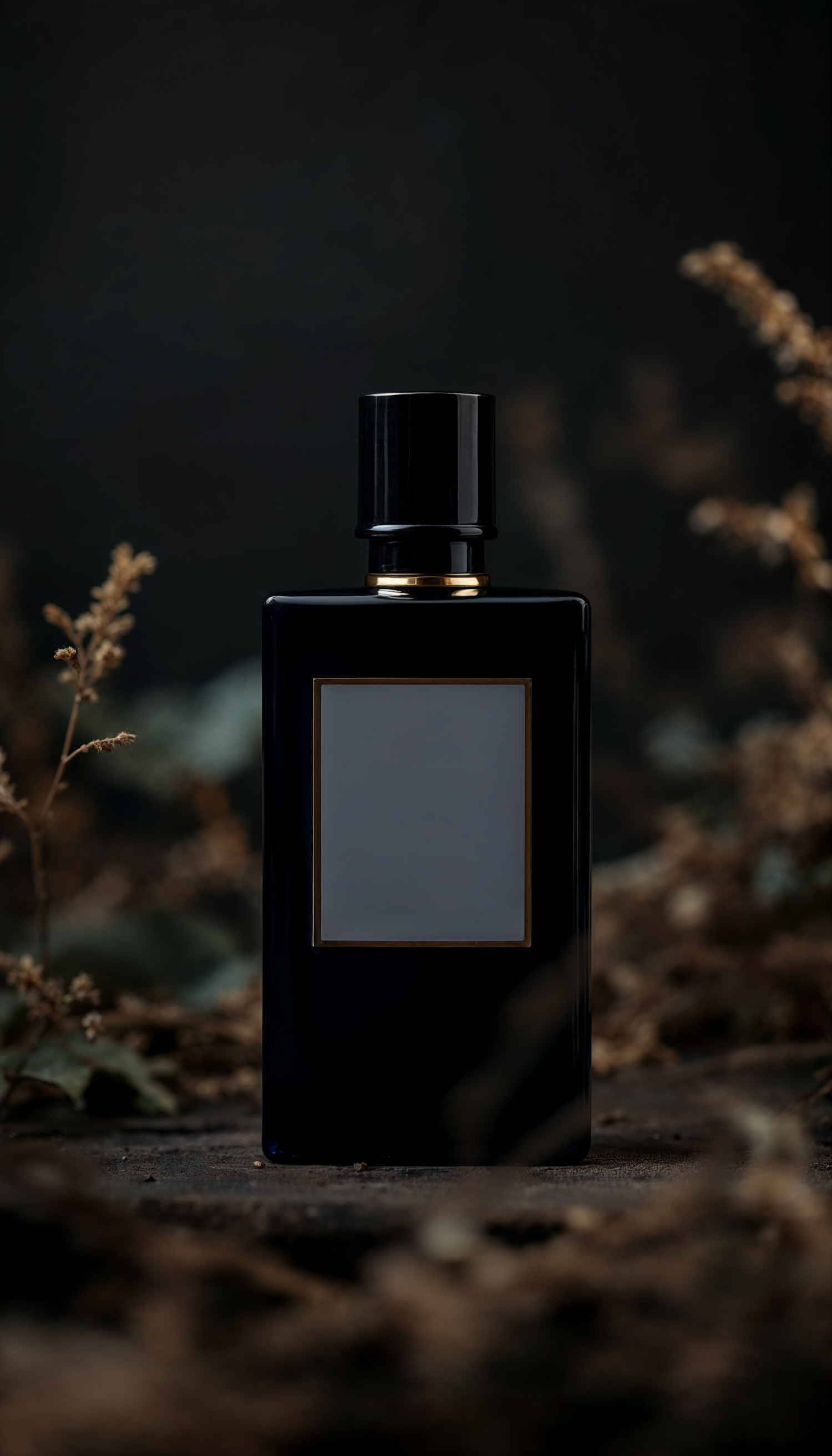 Elegant black perfume bottle with gold accents in a moody, natural setting. Sophisticated and luxurious design focus.