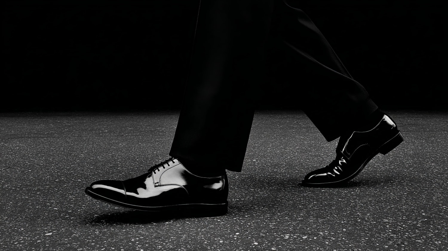 Polished black dress shoes in motion on a dark textured surface, showcasing their glossy finish and sleek design.