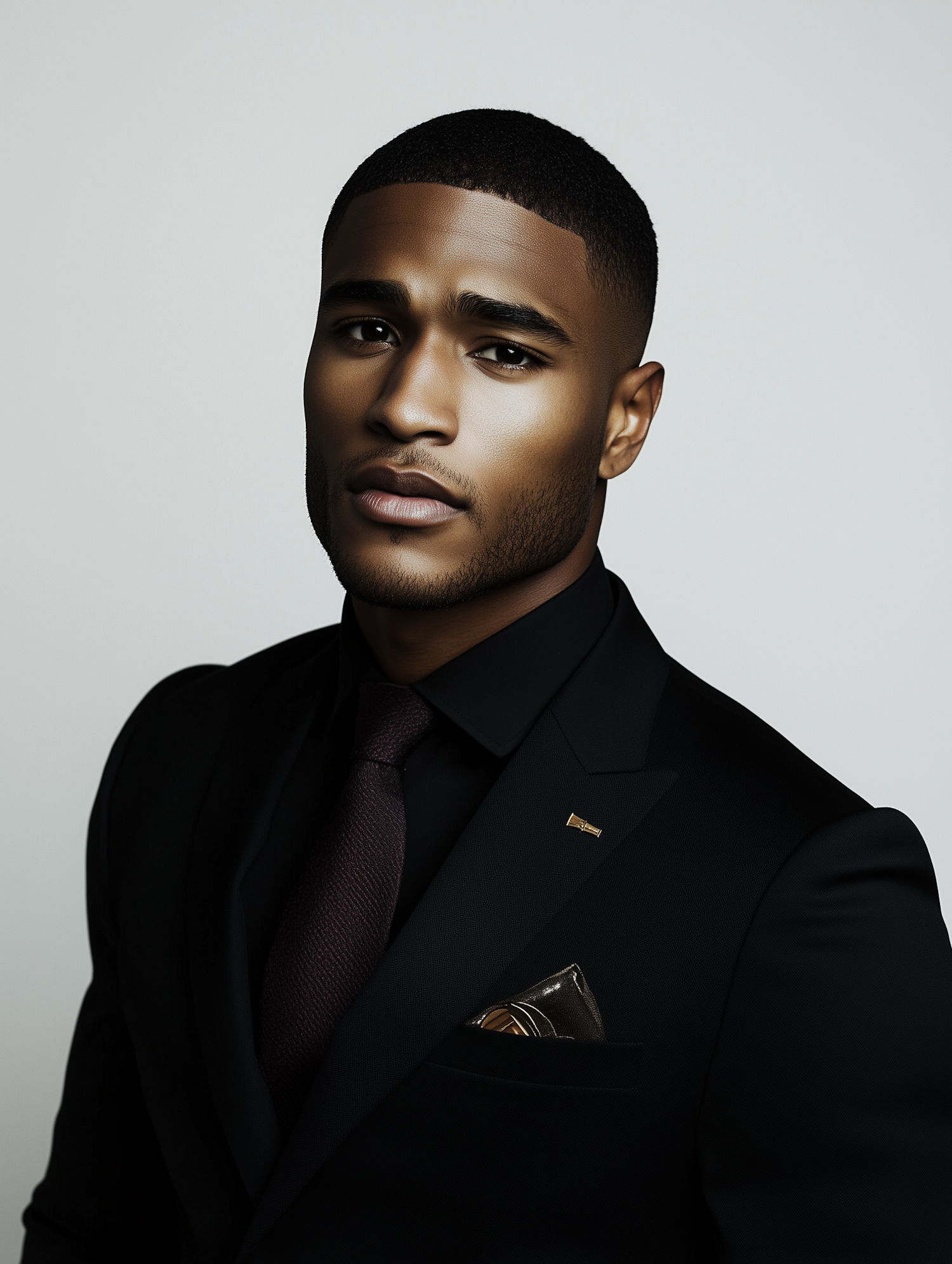 A confident man in a sleek black suit with a maroon tie and pocket square, set against a light gray background.