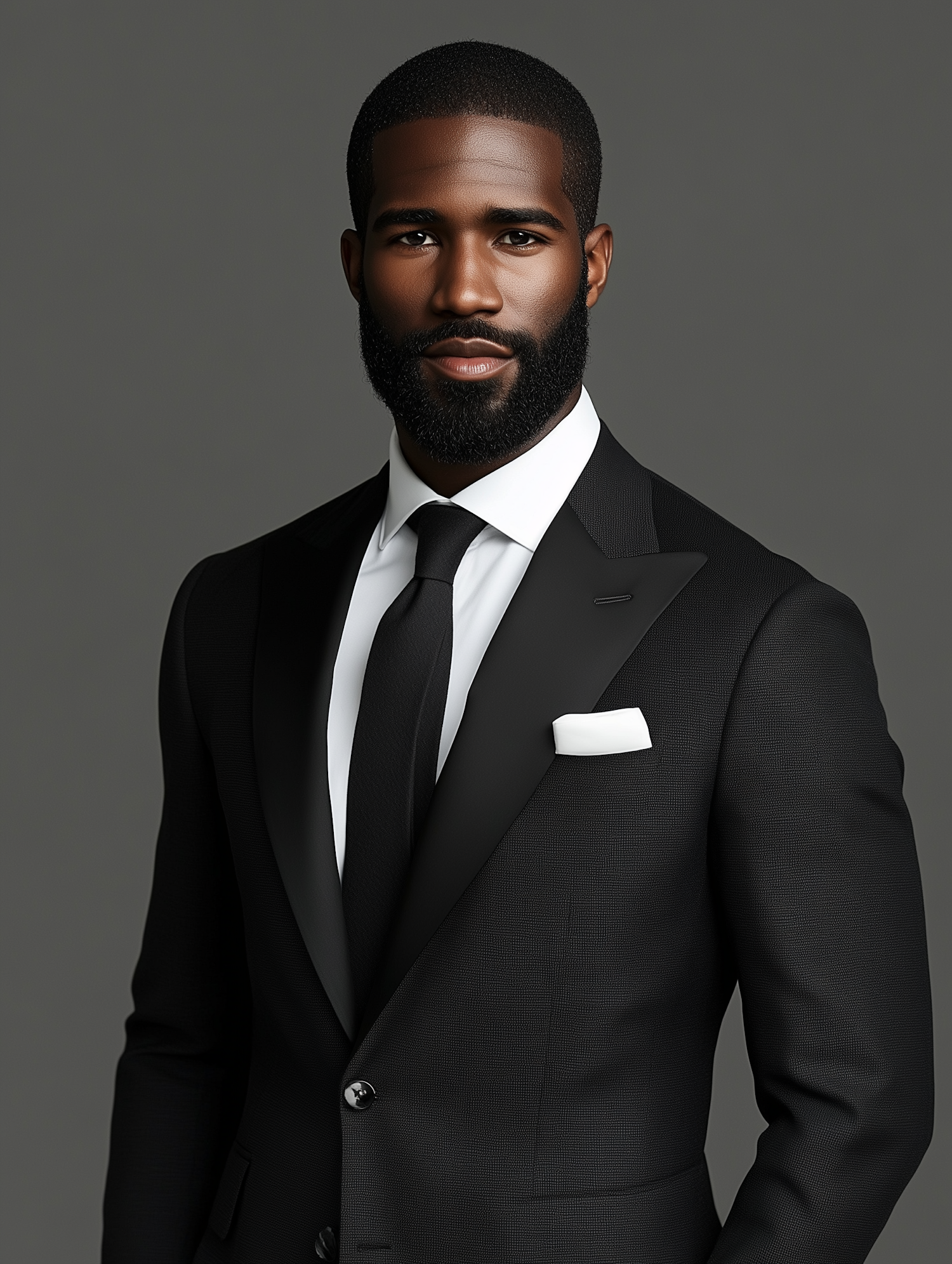 A confident man in a tailored black suit with a white pocket square, neatly groomed beard, and neutral gray background.