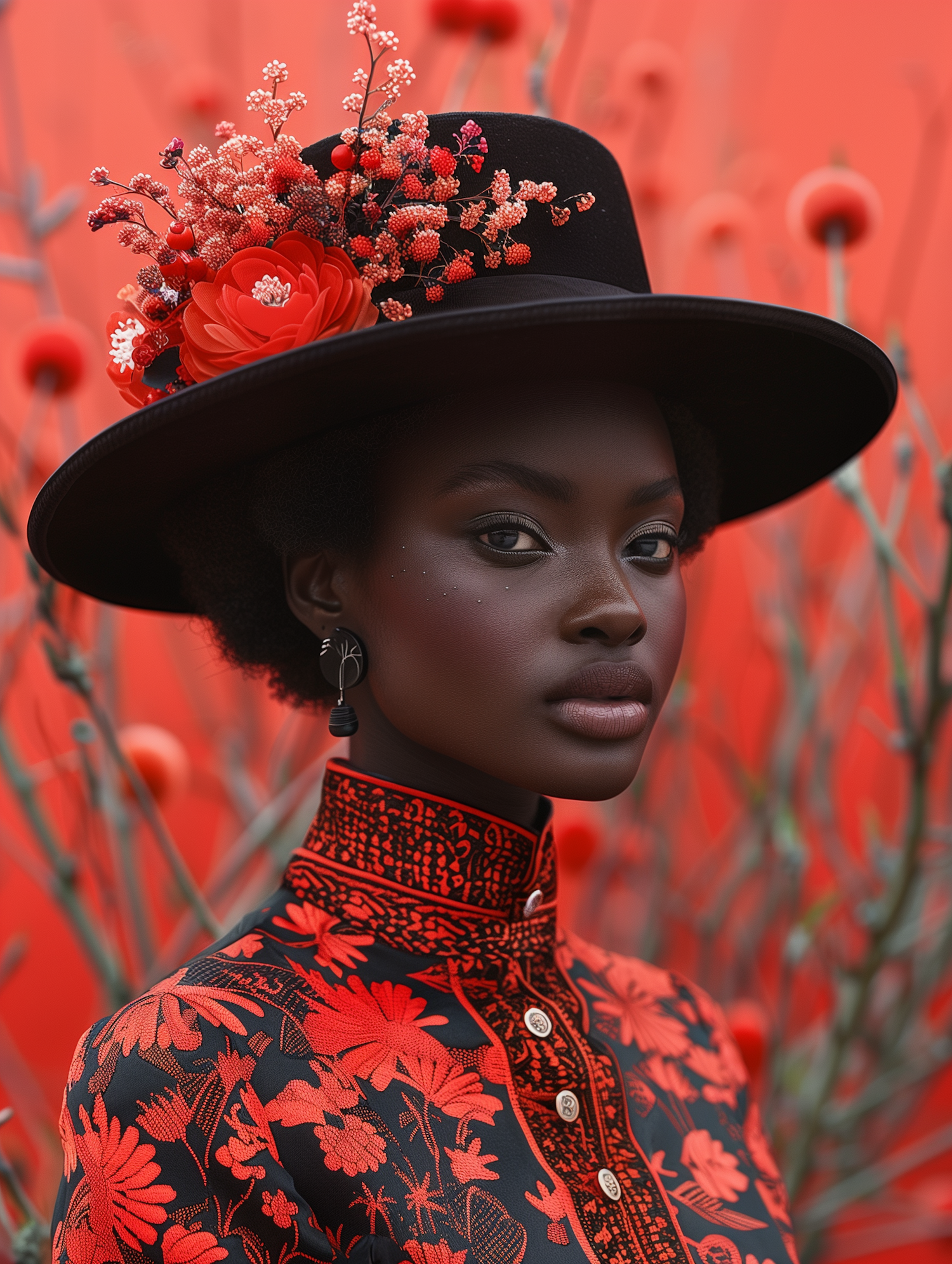 Elegant portrait of a woman in a floral hat and dress against a vivid red background, exuding confidence and style.