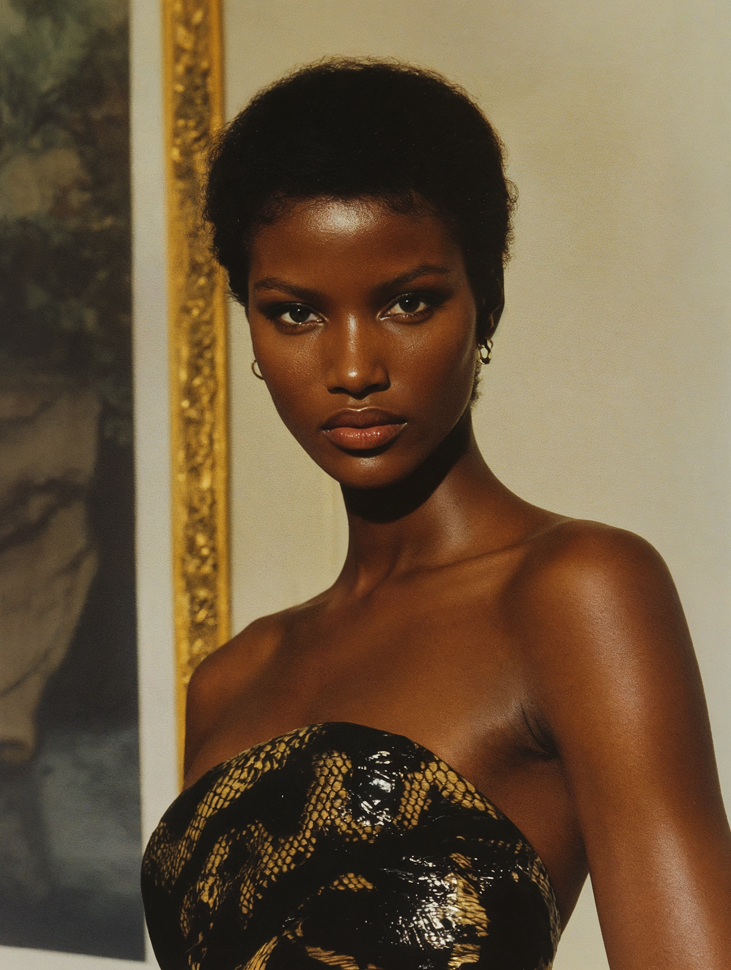Elegant portrait of a woman in a black and gold snake-print dress, with natural short hair and a confident gaze, set against a classic backdrop.