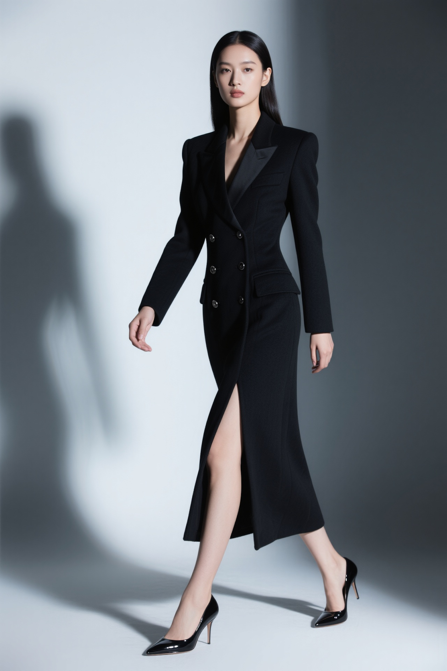 Elegant woman in a black blazer dress with a high slit, paired with glossy black heels, walking confidently against a minimalist backdrop.