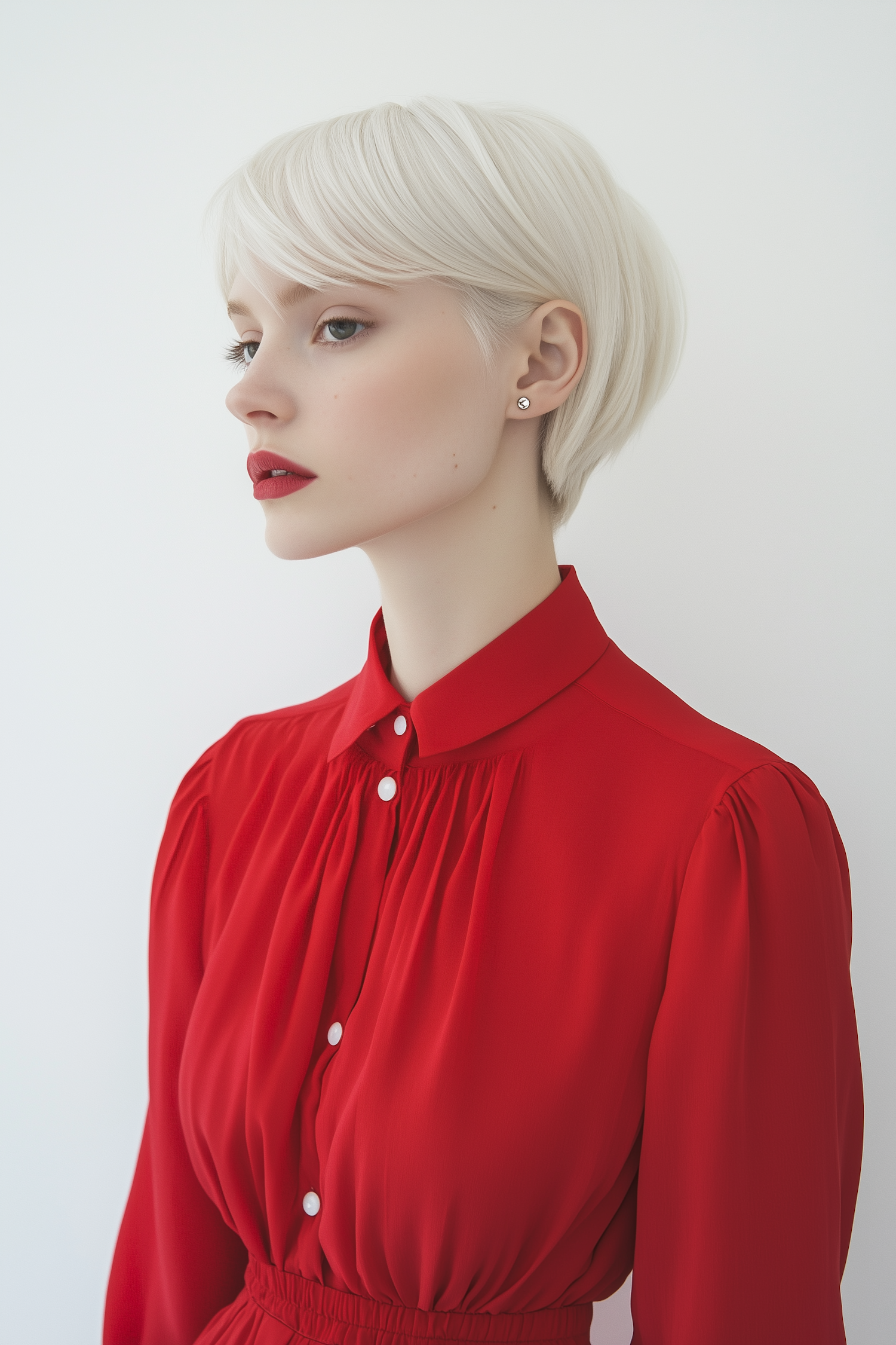 Elegant woman with platinum blonde hair, red lipstick, and a vibrant red blouse, posing against a plain white background.