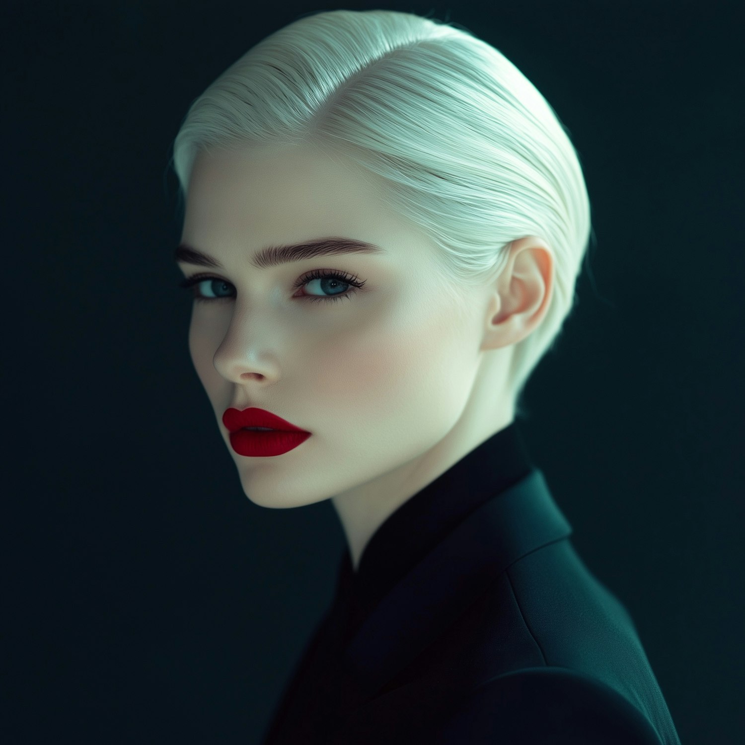 Elegant portrait of a woman with platinum blonde hair, vivid red lips, and piercing blue eyes against a dark, minimalist background.
