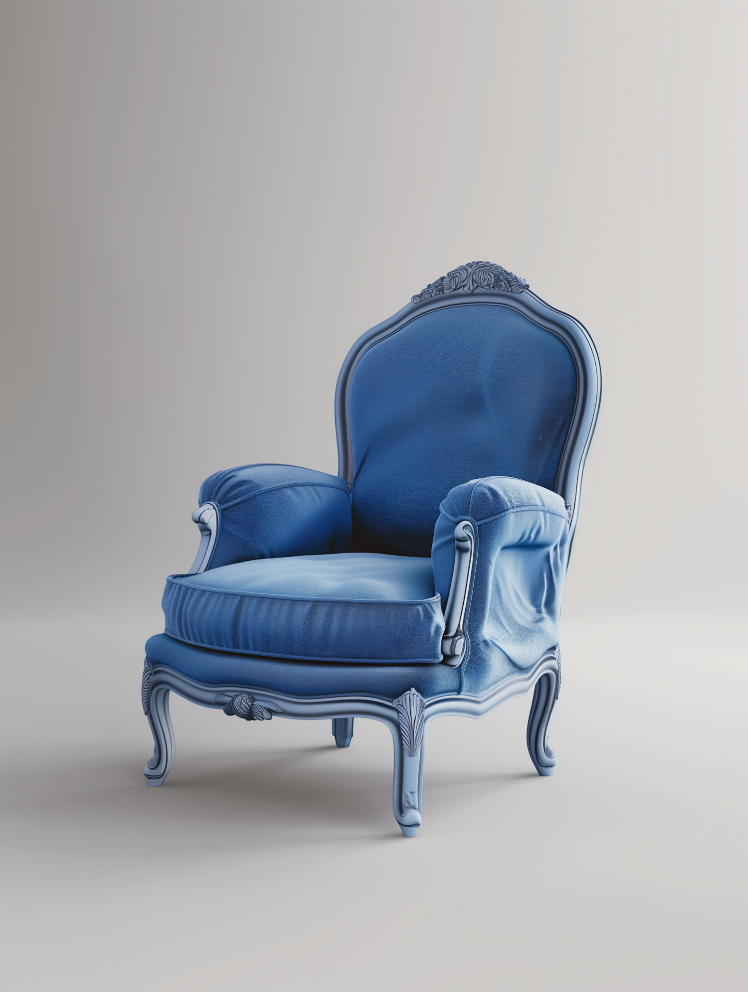 Elegant blue armchair with intricate carvings and plush cushions, perfect for adding a vintage touch to any space.