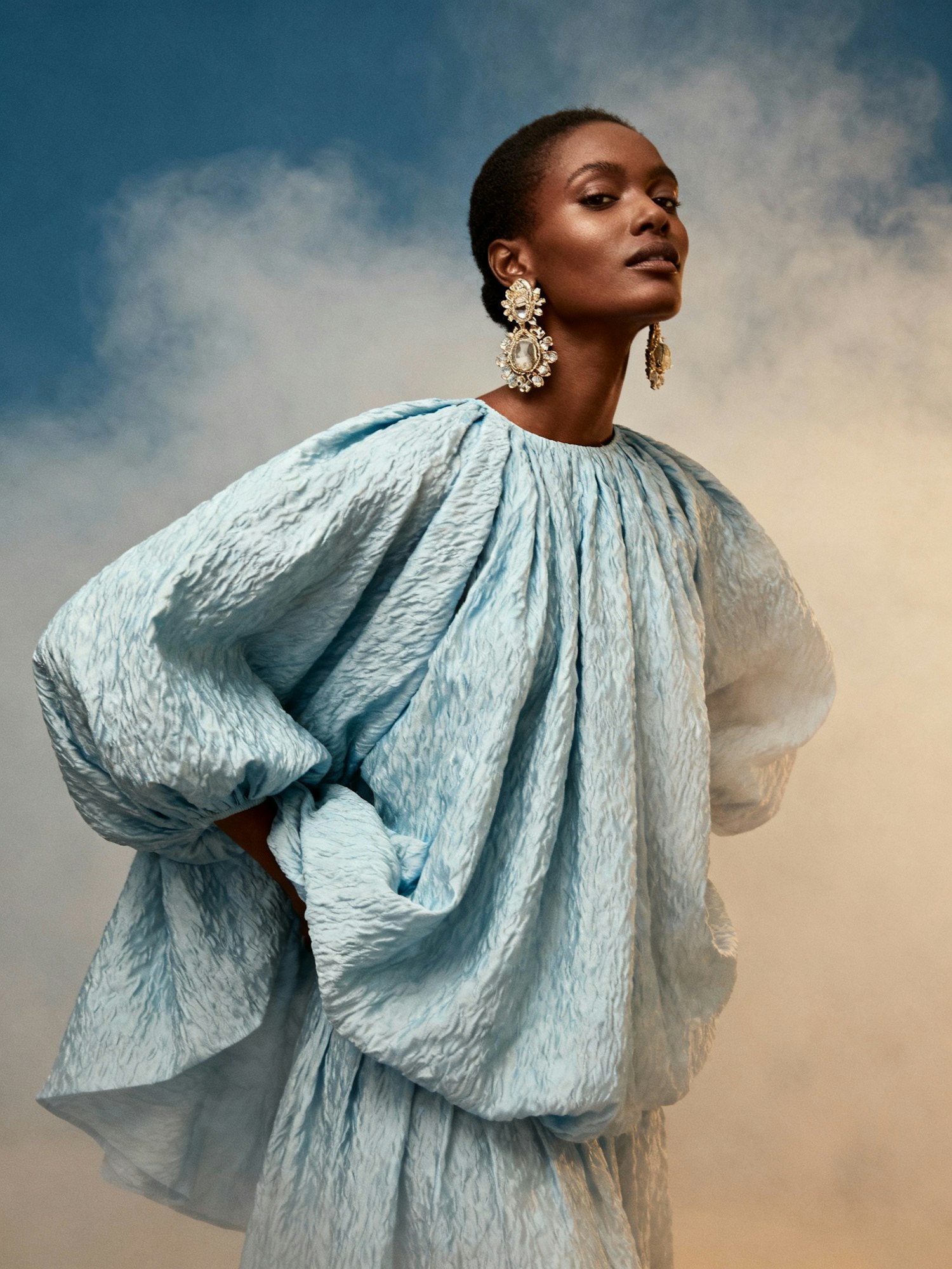A person in a textured light blue outfit with voluminous sleeves, accessorized with ornate earrings, against a softly lit gradient background.