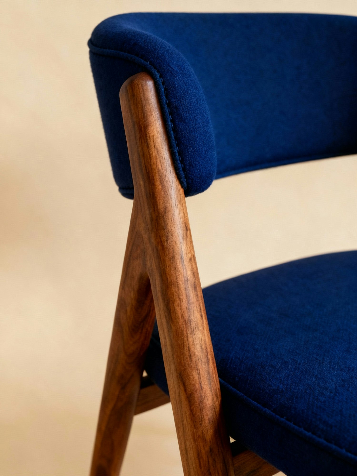 Close-up of a modern chair with a blue upholstered seat and backrest, paired with a polished wooden frame, set against a beige background.