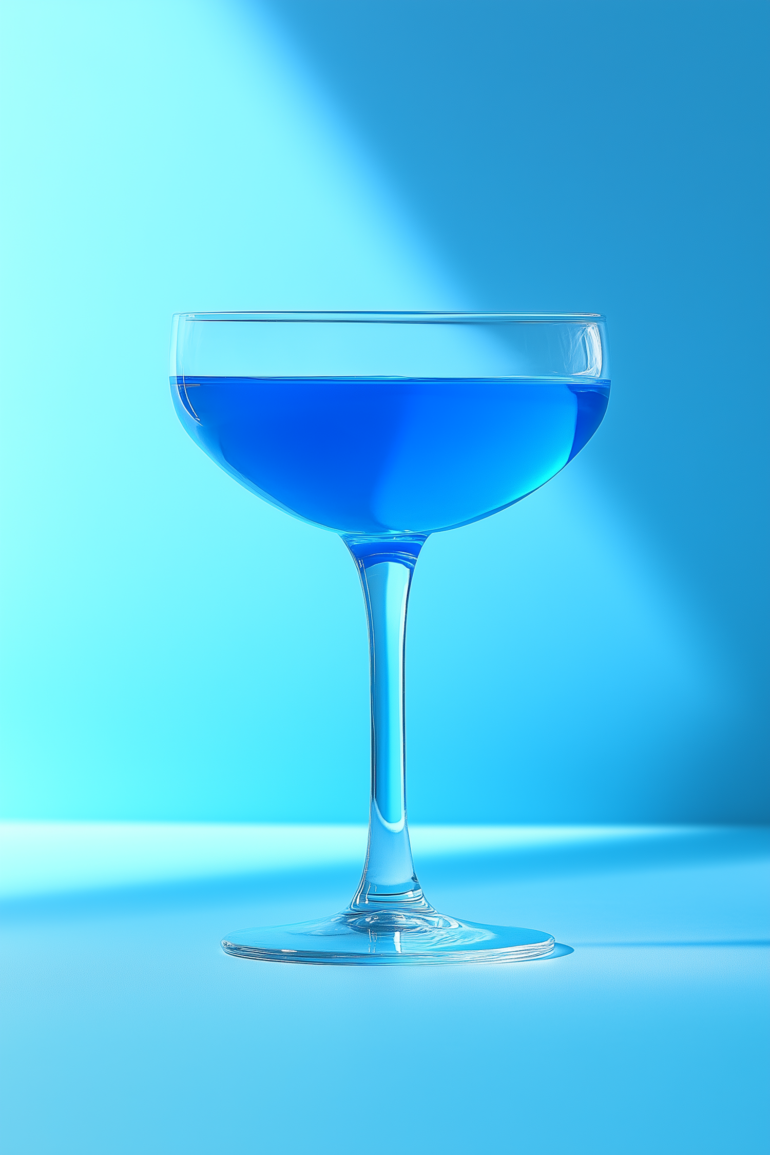 Elegant coupe glass with a vibrant blue cocktail against a bright blue background, perfect for a modern and refreshing vibe.