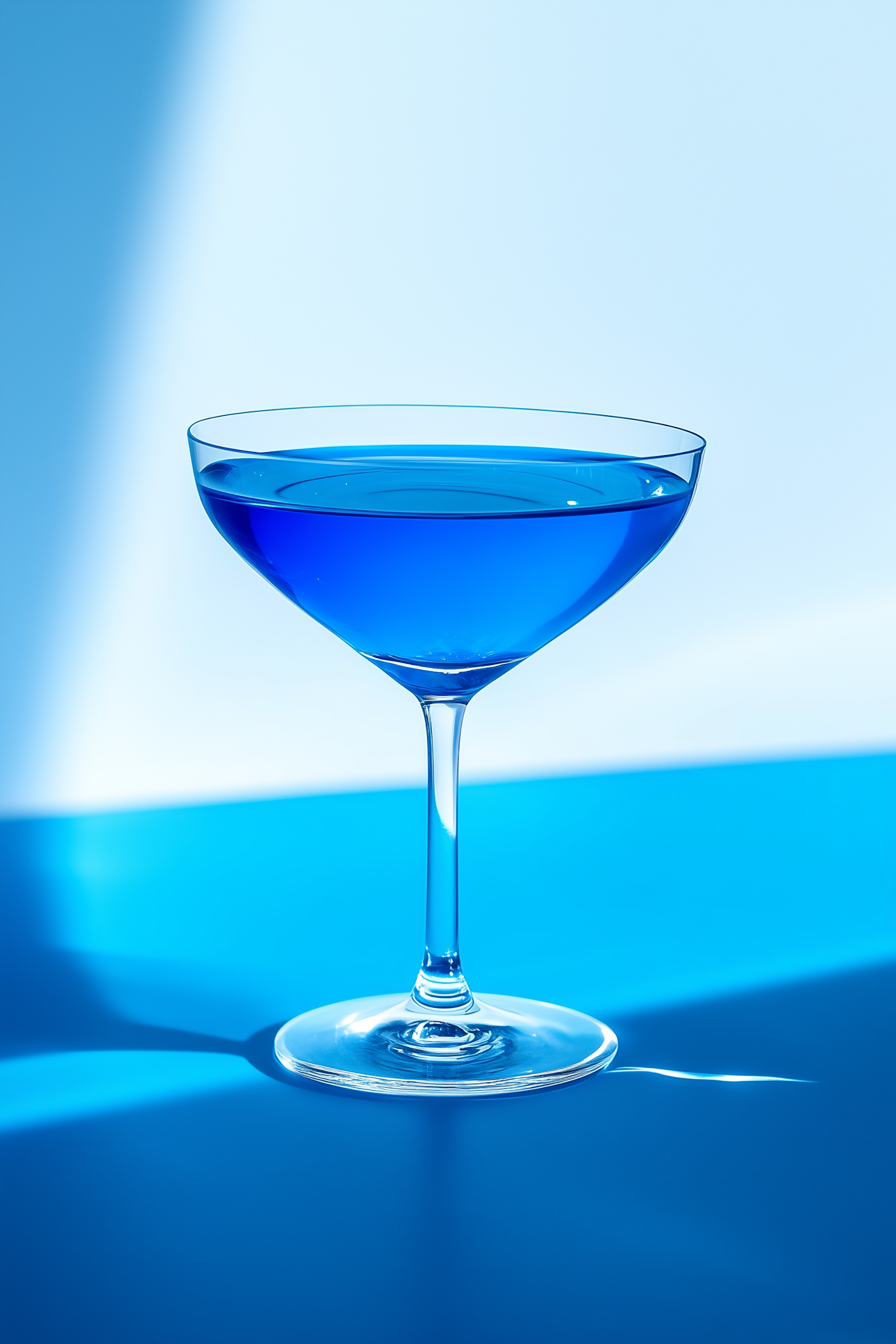 Elegant coupe glass with vibrant blue liquid on a light blue background, creating a minimalistic and striking visual contrast.