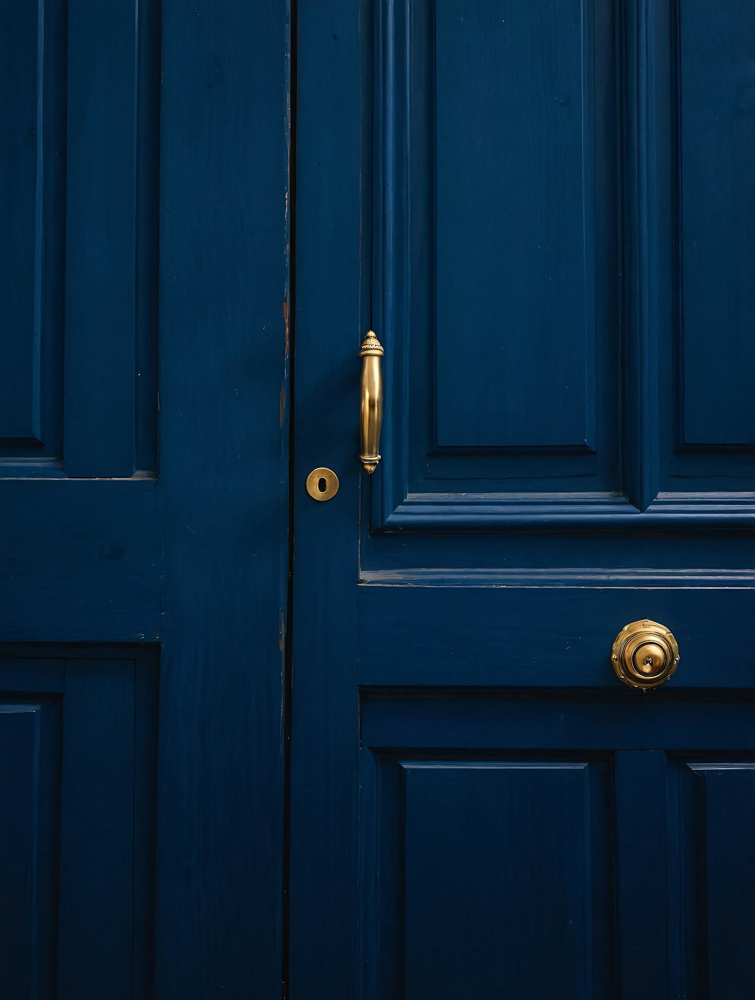 Elegant deep blue wooden door with brass handle and lock, showcasing a classic design and rich color contrast.