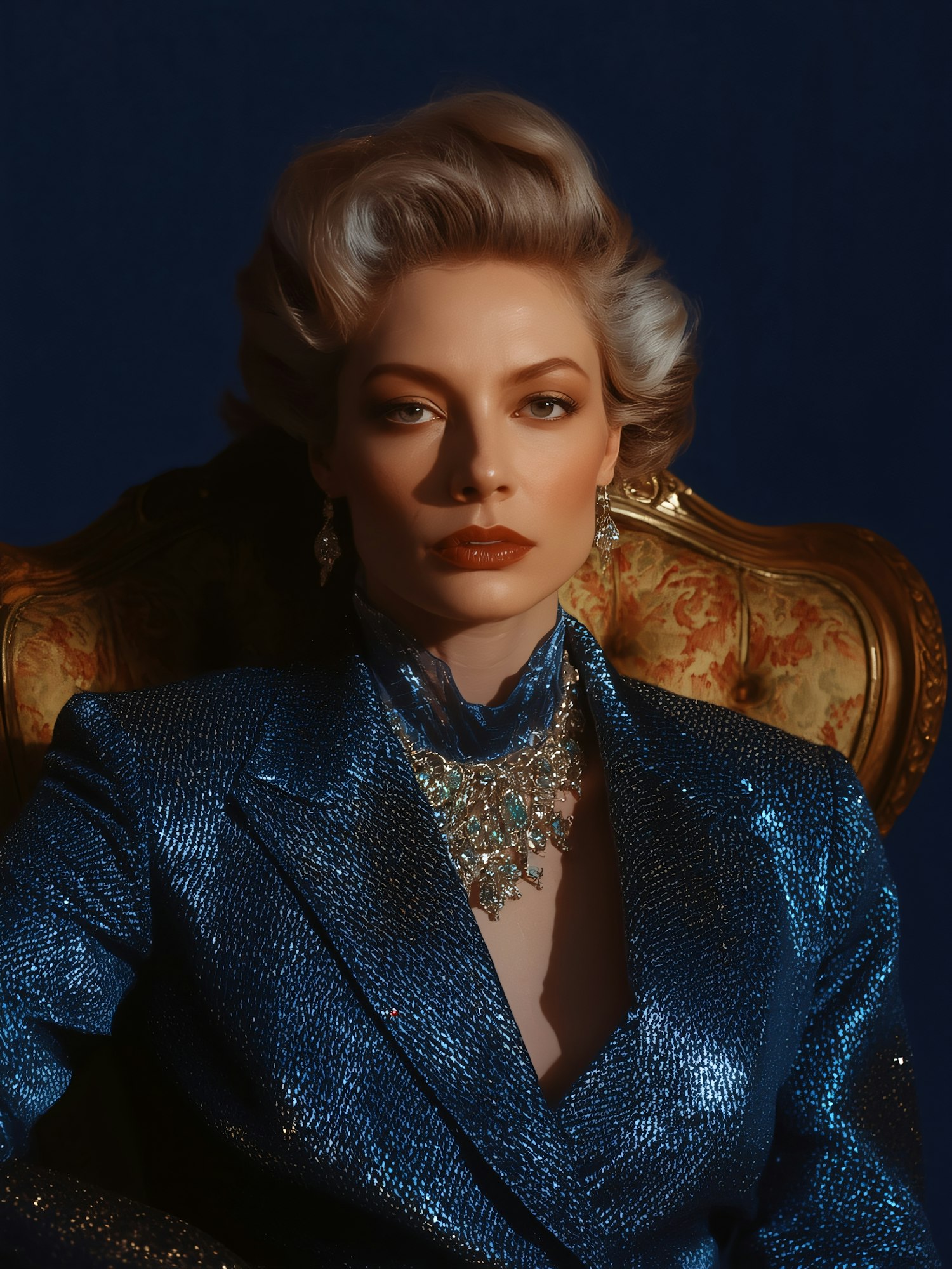 A person in a shimmering blue suit and ornate jewelry sits against a deep blue background, exuding elegance and sophistication.