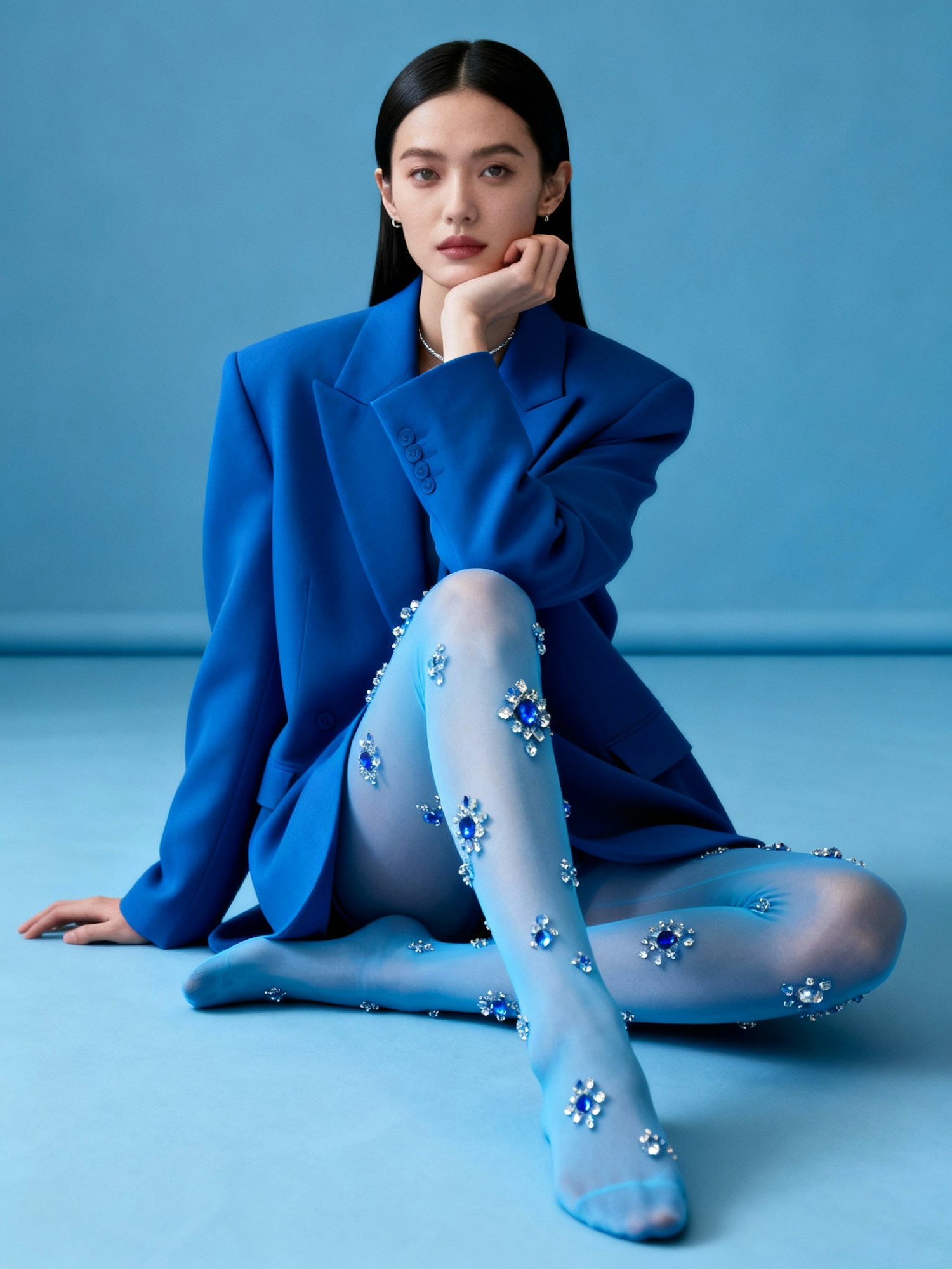 A woman in a blue blazer and jeweled tights sits against a blue background, creating a stylish and cohesive visual aesthetic.