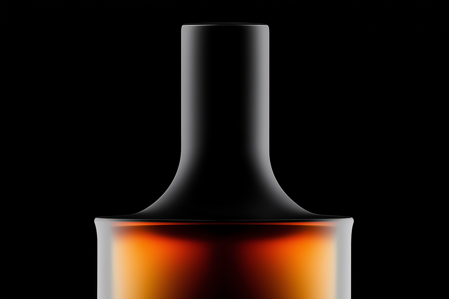 Minimalist black bottle with amber liquid, sleek design, and smooth curves against a dark background. Perfect for luxury branding.