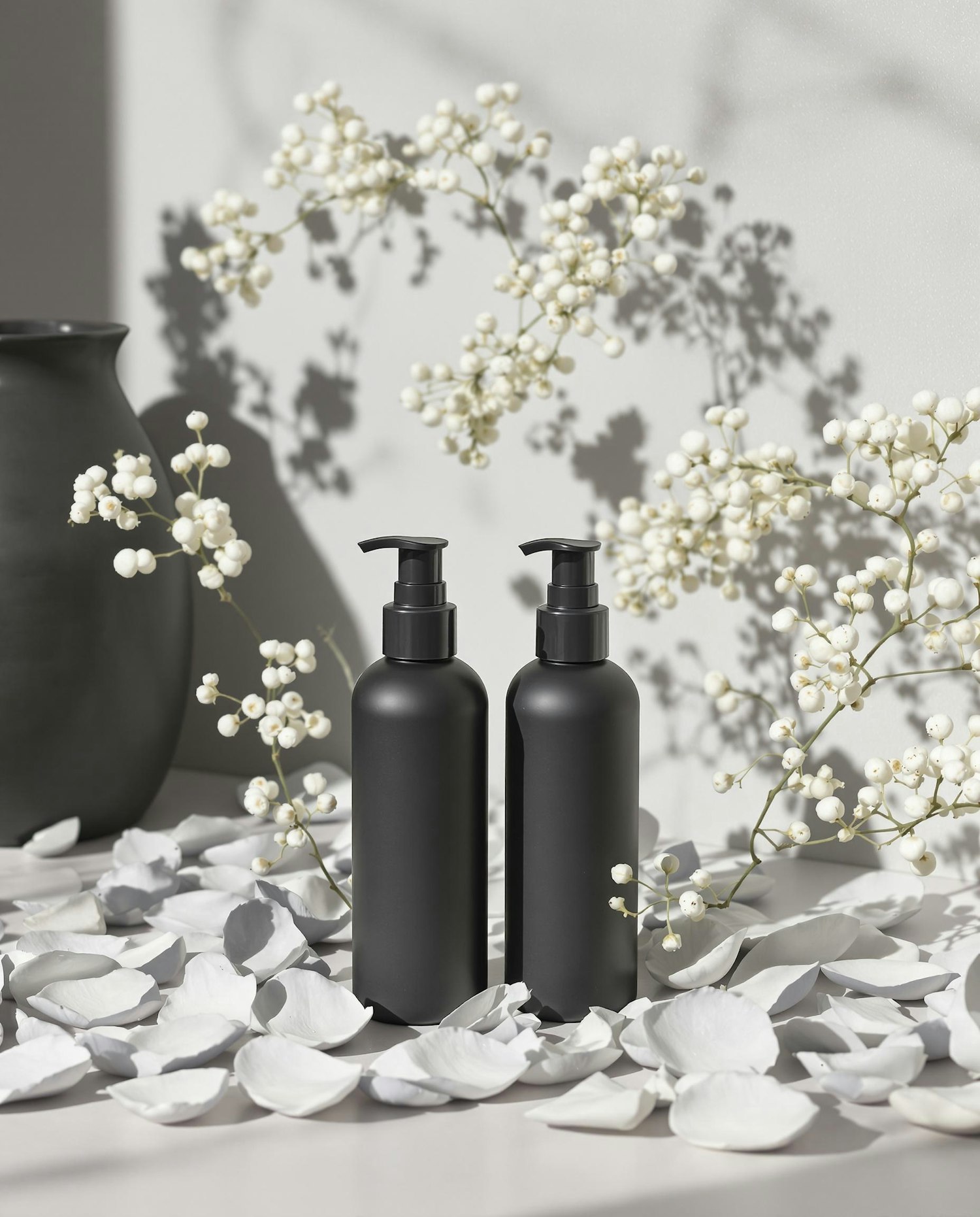 Elegant black pump bottles sit amidst white petals and berries, creating a minimalistic and stylish aesthetic for premium content users.