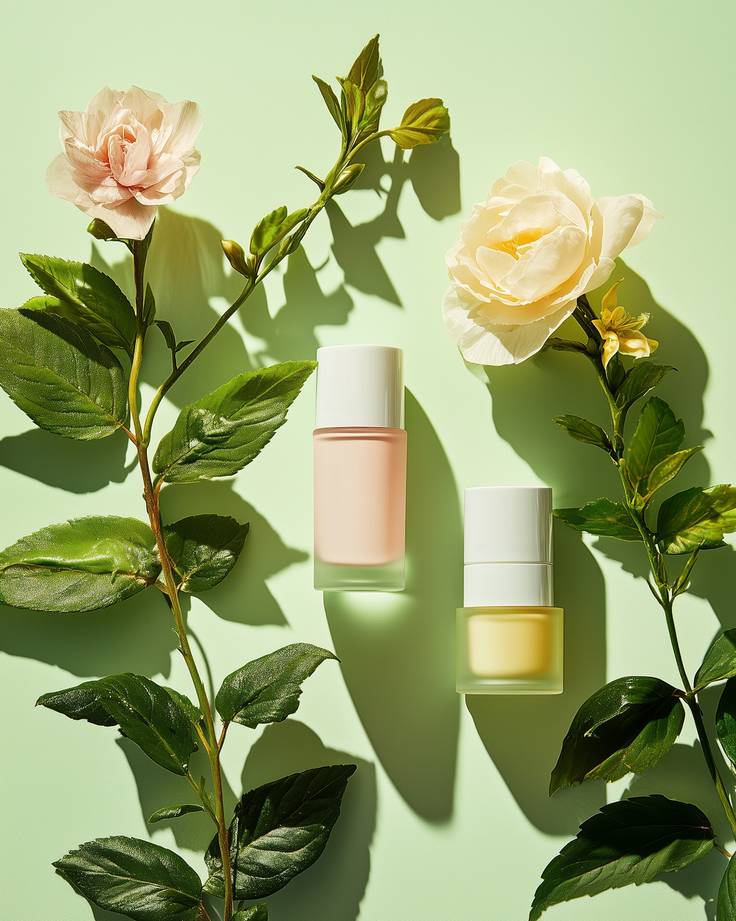 Elegant glass bottles with pink and yellow hues, surrounded by lush green leaves and roses on a light green background.