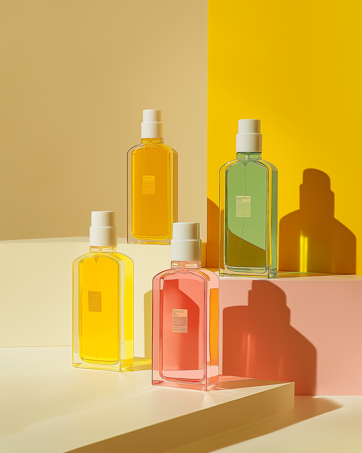 Stylish glass bottles with colorful liquids on a minimalist background, casting artistic shadows in a modern setting.
