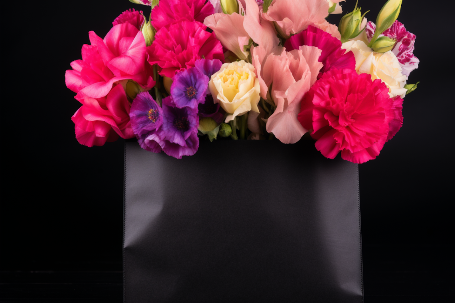 Vibrant bouquet of pink, peach, purple, and yellow flowers in a sleek black bag against a dark background.