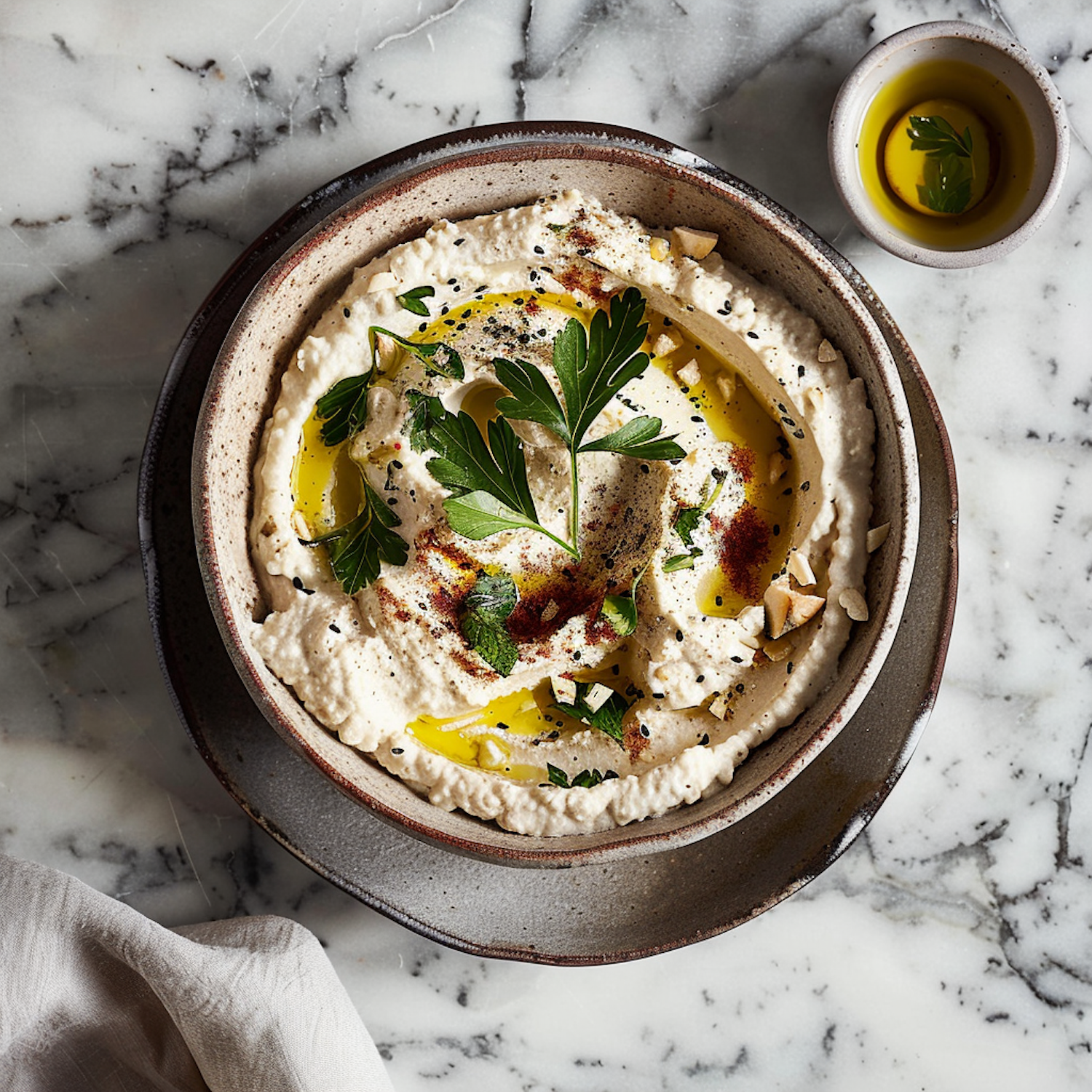 Creamy hummus in a rustic bowl with olive oil, parsley, and paprika on a marble surface. Elegant and appetizing presentation.