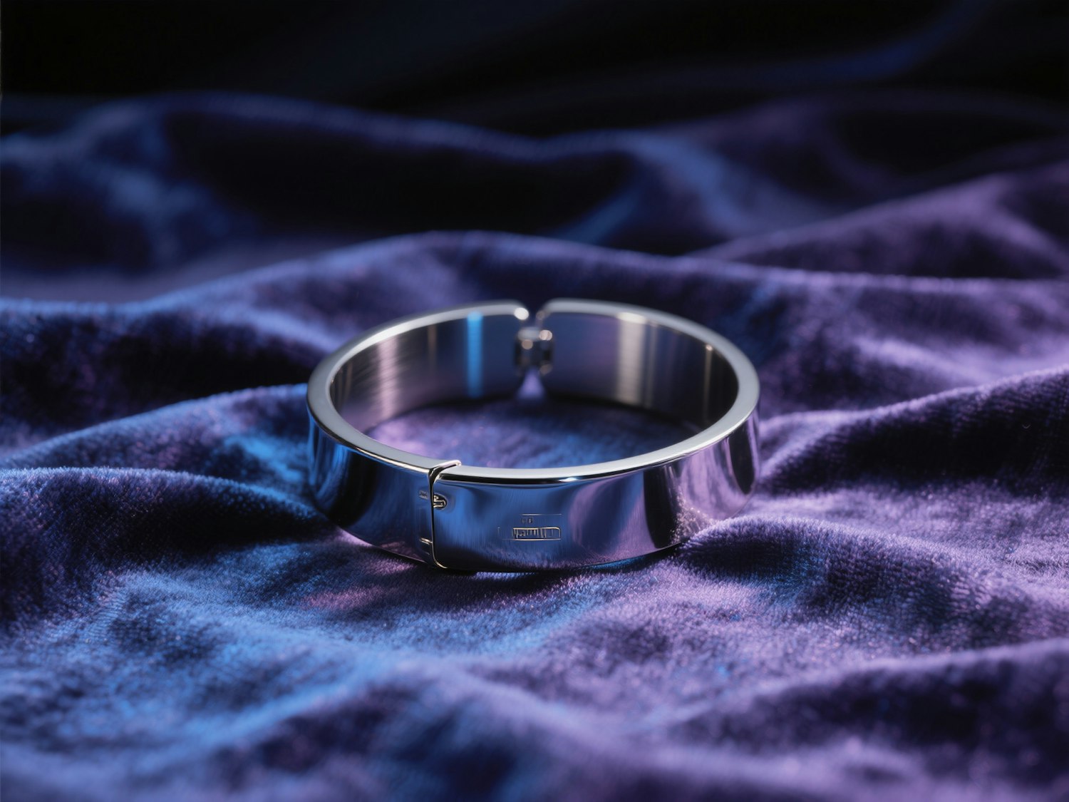 A titanium wrist cuff resting atop crushed velvet, reflective surfaces catching soft LED glow, high-contrast editorial still-life
