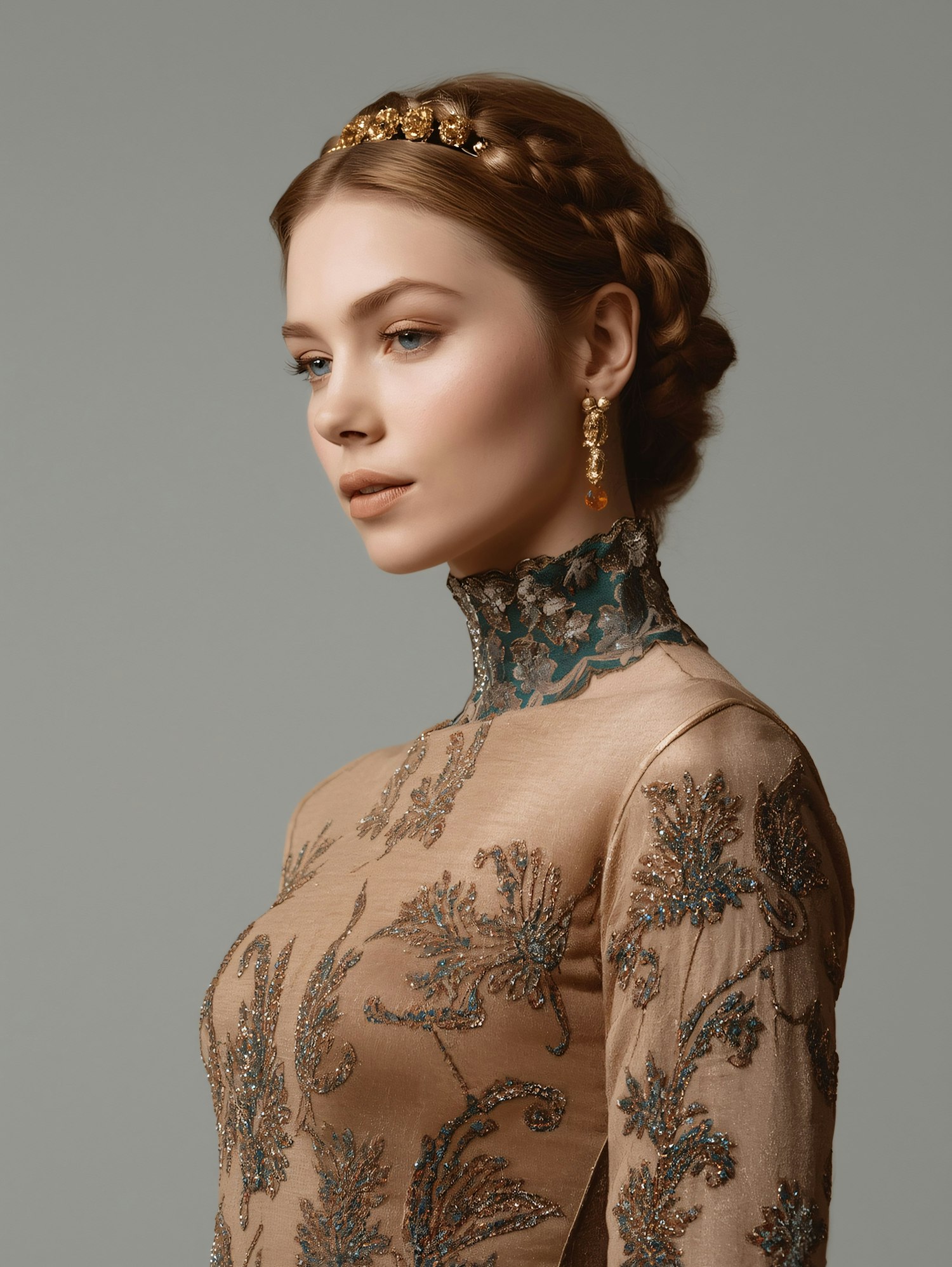 A woman in a beige embroidered gown with a golden headpiece and braided updo, set against a neutral gray background.