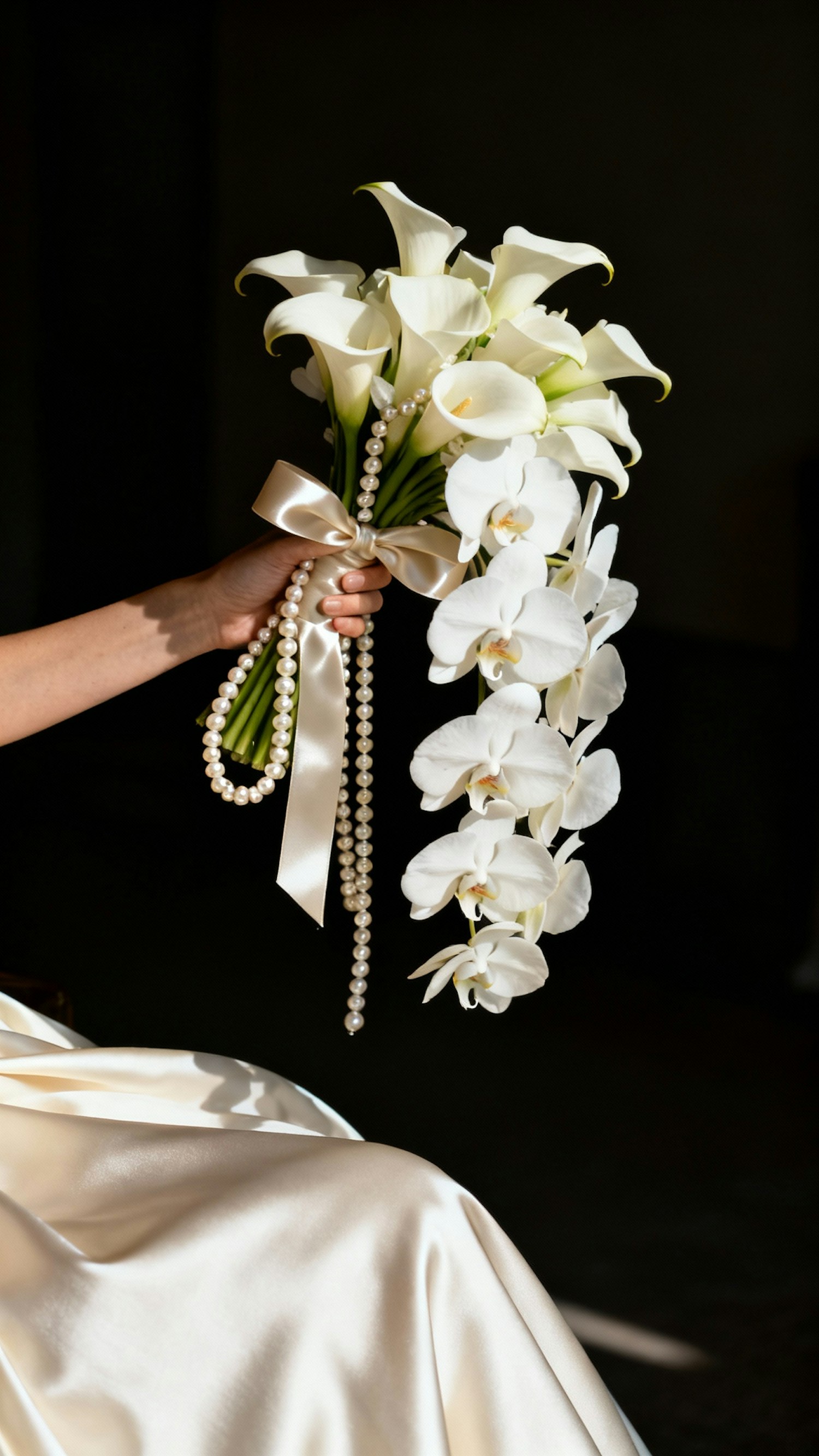 Editorial cinematic shot of a bridal hand carrying a floral bouquet with pearl bead handles. Bouquet made of white calla lilies and cascading orchids, tied with satin ribbon. A small part of the bridal dress in soft ivory silk is visible, clean minimal background. Luxury high-end lighting, dramatic shadows, deep elegant mood. Clearly a floral bouquet, not a handbag.