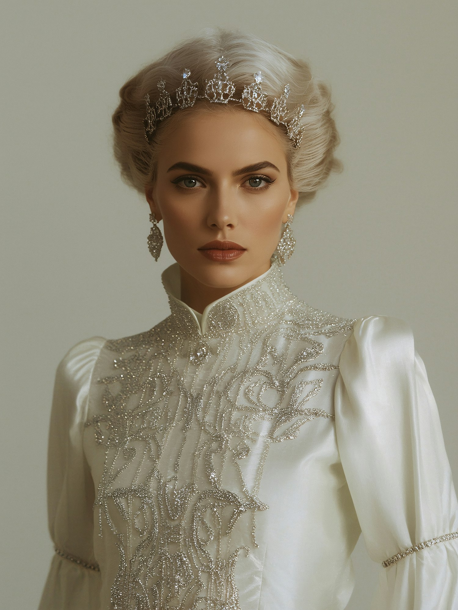A regal woman in a white gown with silver embroidery, wearing a tiara and chandelier earrings, exuding elegance and sophistication.