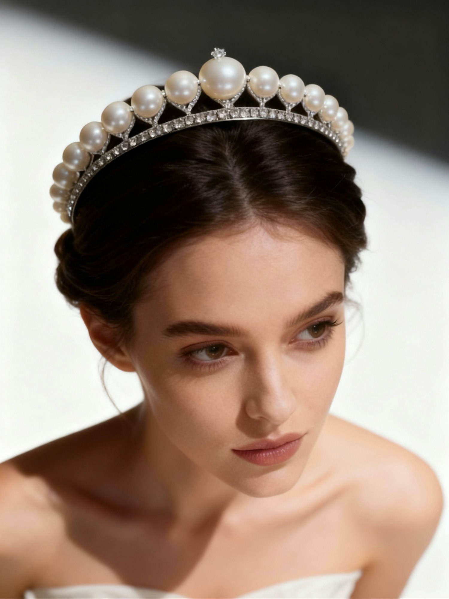A young woman with a pearl and diamond tiara gazes downward, her elegant updo and serene expression highlighted by soft lighting.