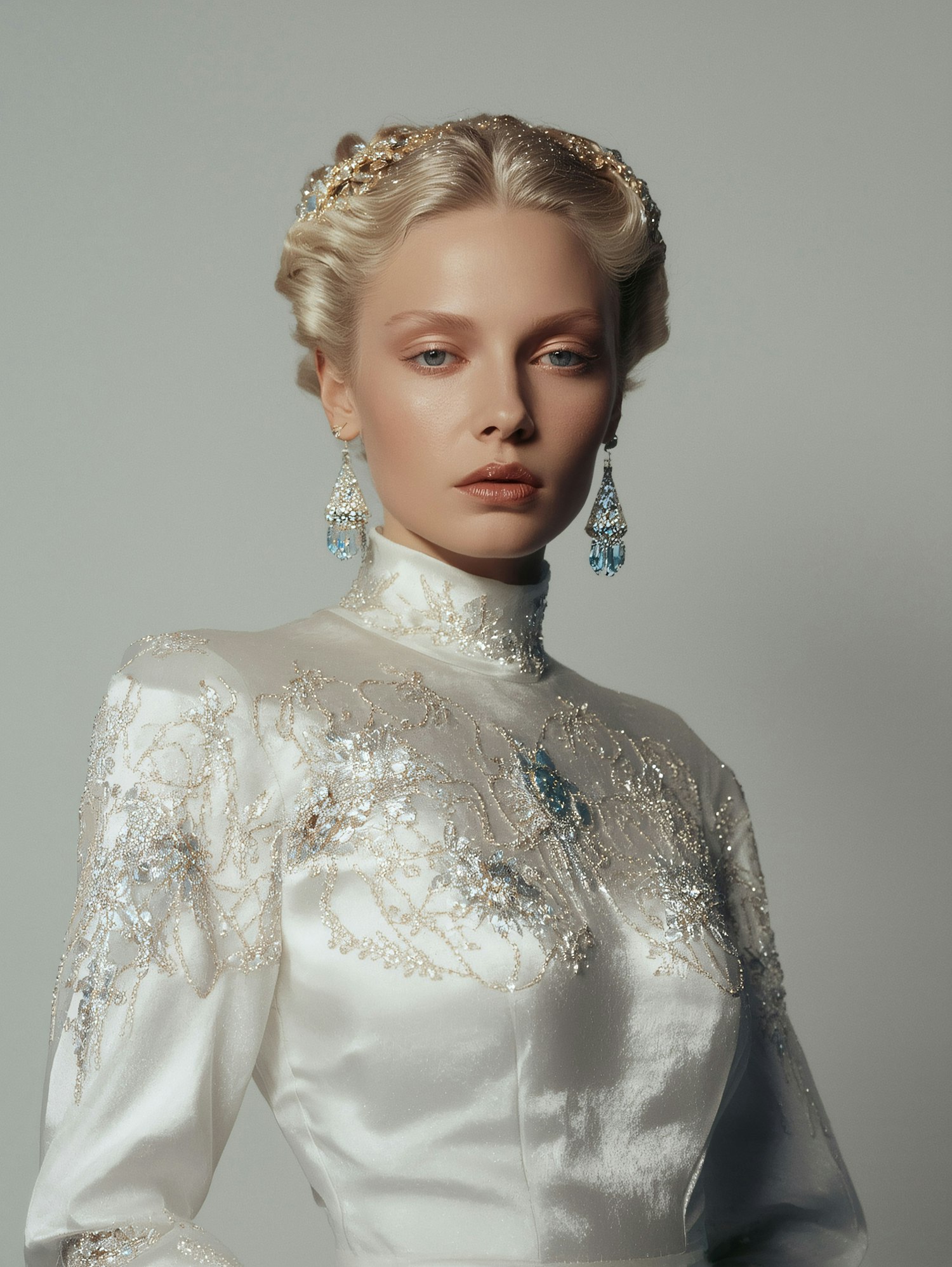 Elegant woman in a white embroidered gown with a golden headpiece and blue gemstone earrings, exuding sophistication and grace.
