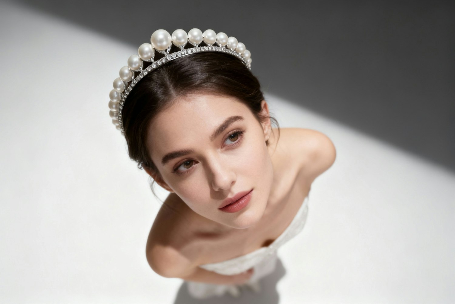 A close-up of a woman wearing a pearl tiara, gazing upward with a serene expression, set against a softly lit background.