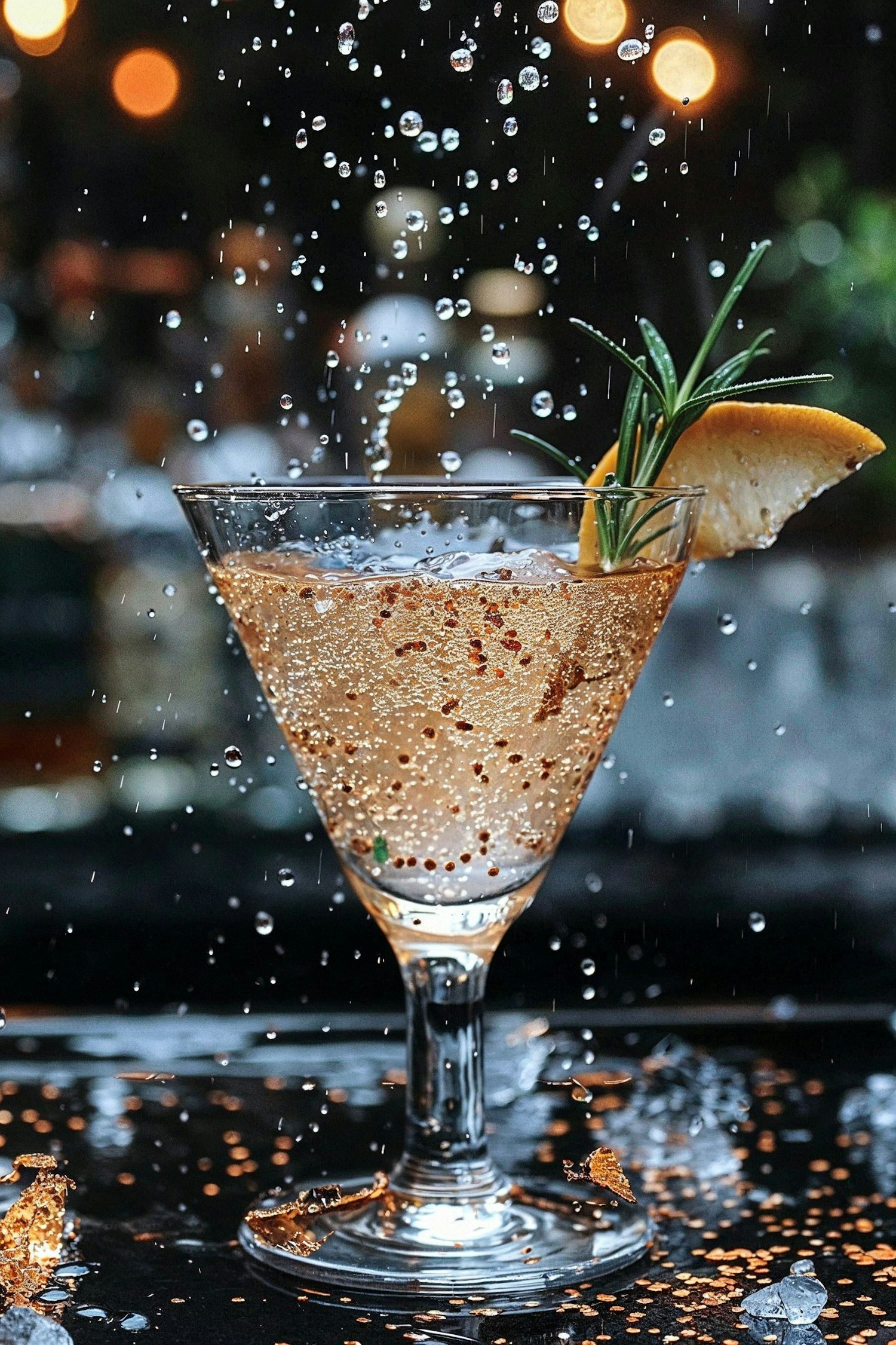 Elegant cocktail with rosemary and lemon garnish, sparkling bubbles, and dynamic water droplets against a warm bokeh background.
