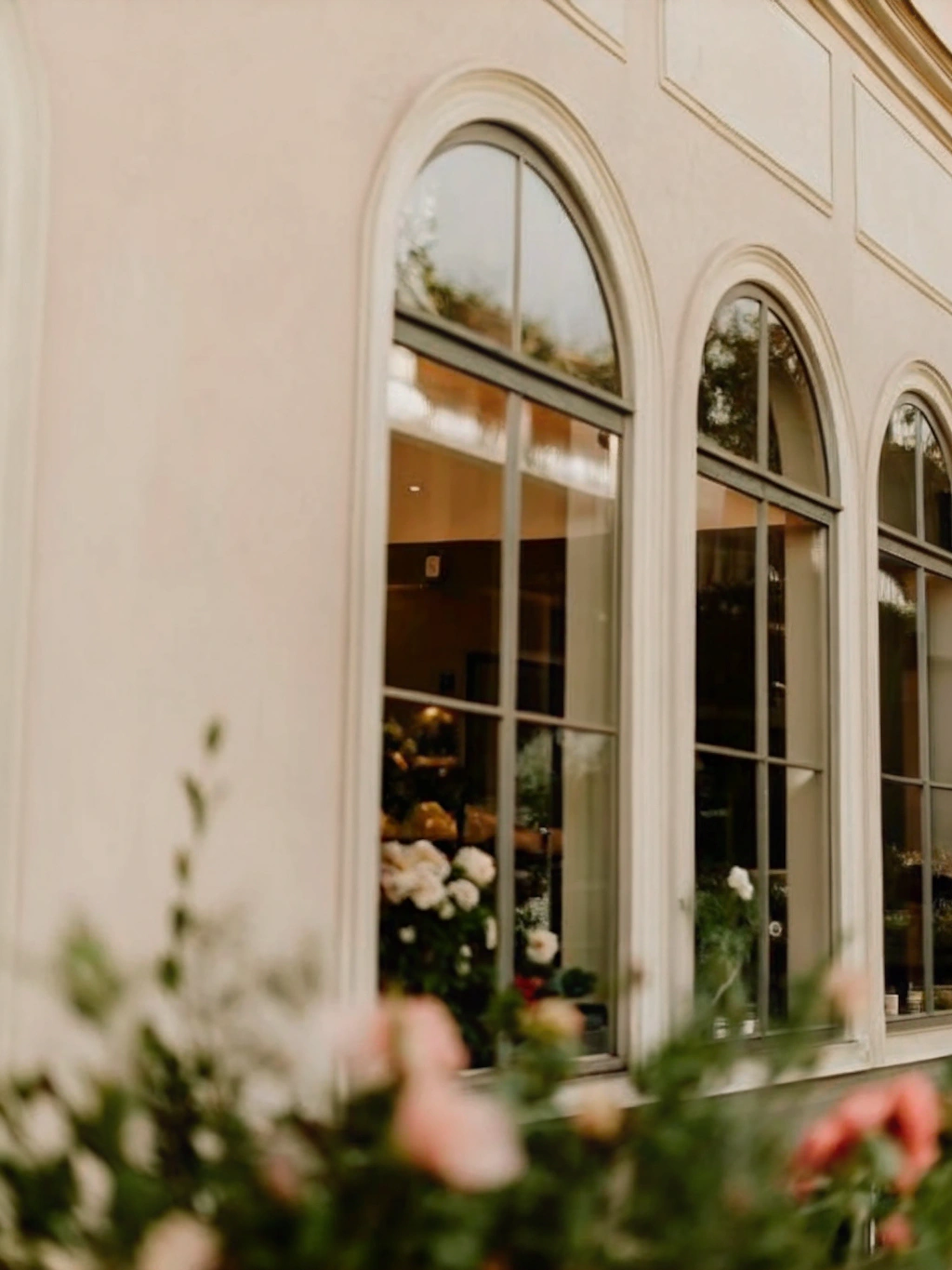 Elegant arched windows of a beige building with floral displays inside, framed by blurred pink and green foliage in the foreground.