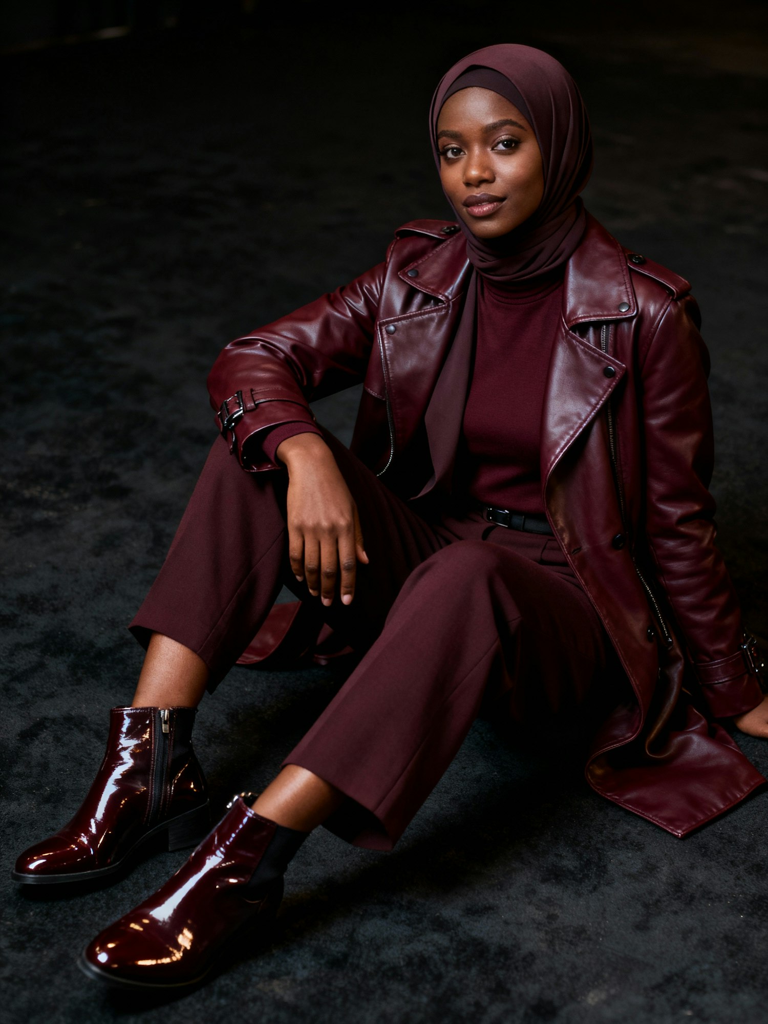 A stylish woman in a burgundy outfit and hijab sits confidently, showcasing a coordinated look with a leather jacket and shiny boots.