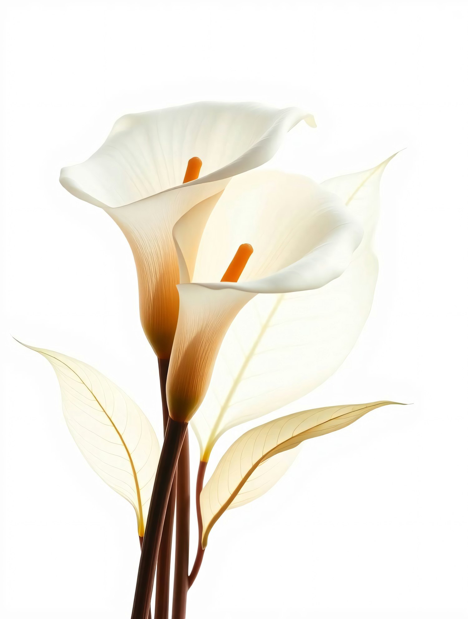 Elegant calla lilies with creamy petals and orange centers, paired with translucent green leaves on a bright white background.